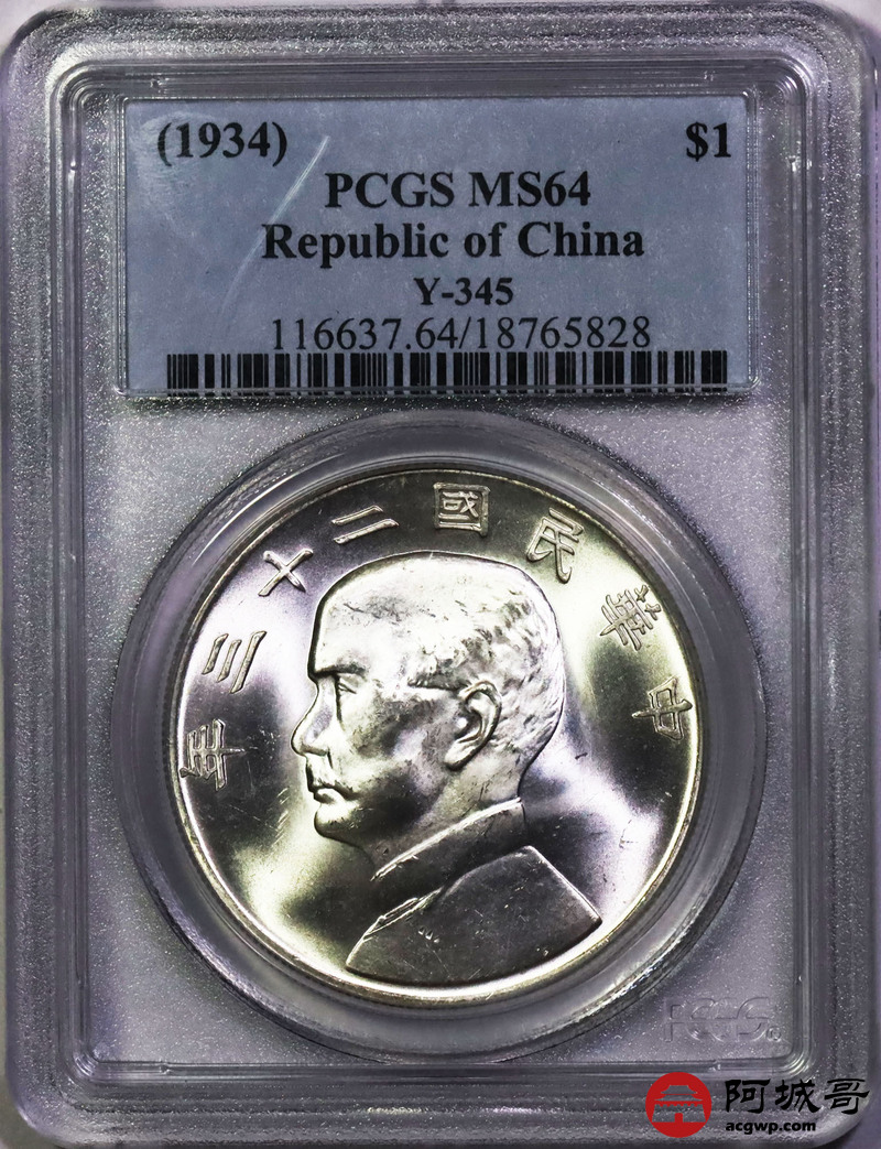 Lot:6698 1934民国二十三年孙中山像背帆船壹圆银币一枚,原色光 PCGS MS64