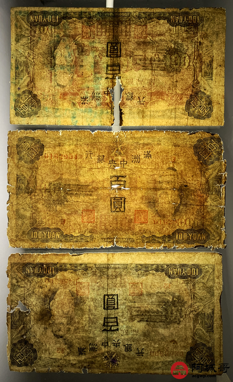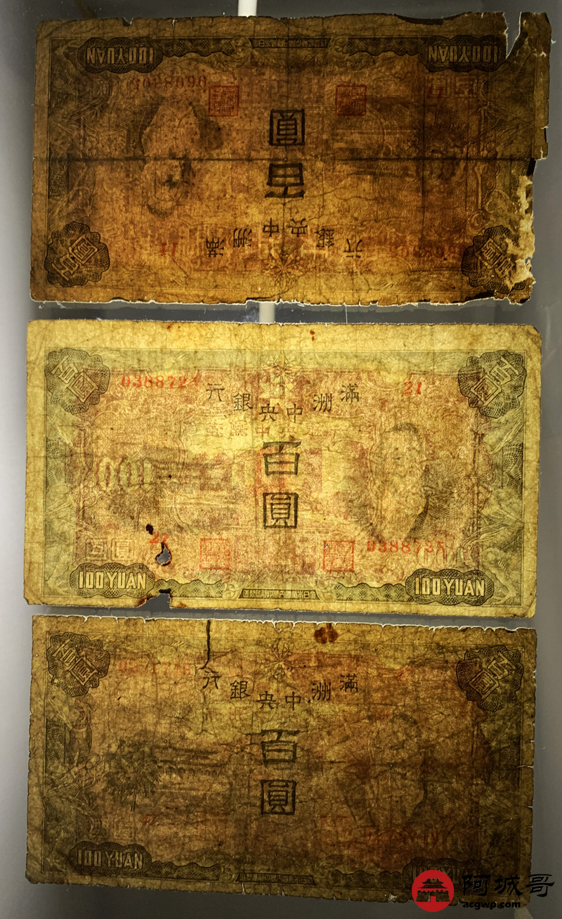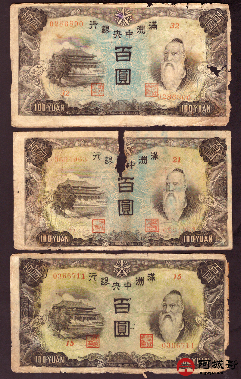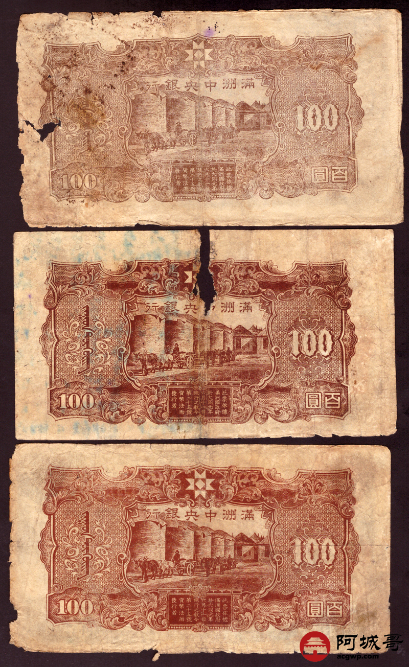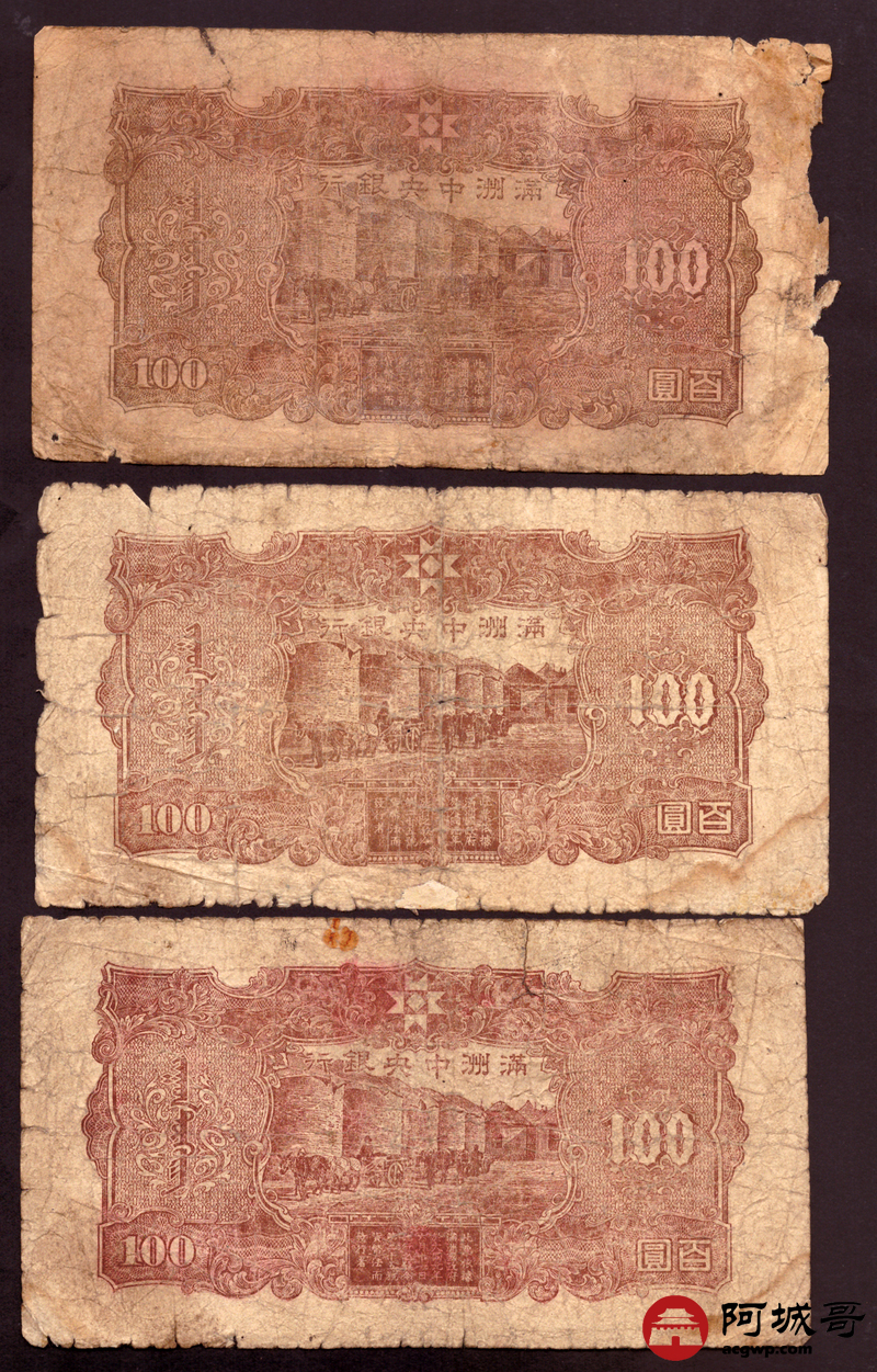 Lot:76 满洲中央银行 百圆 10张 修补 55至57成新