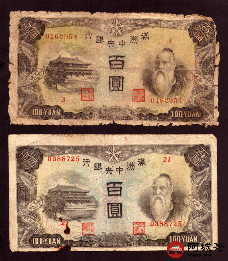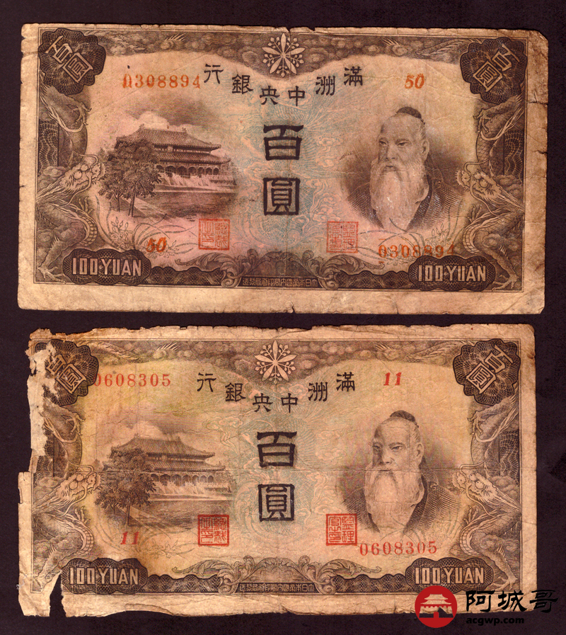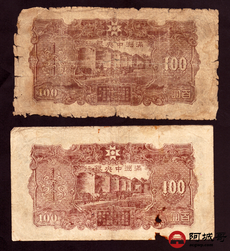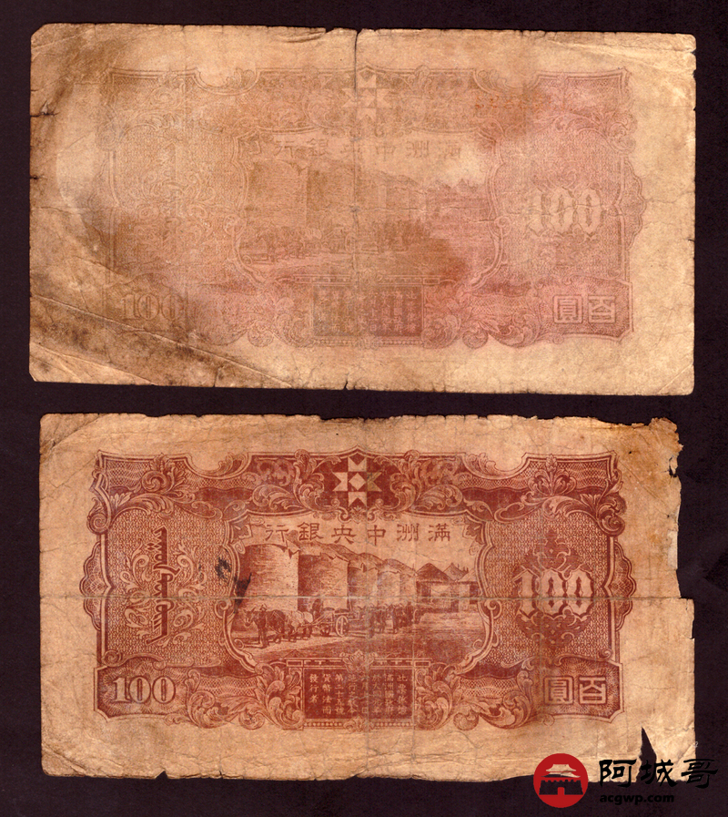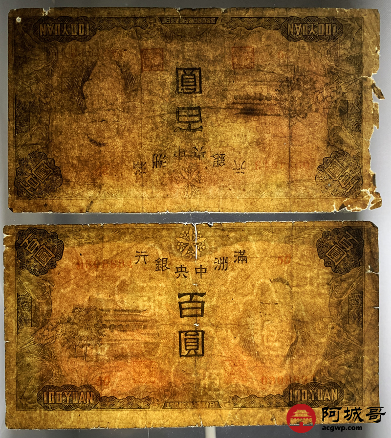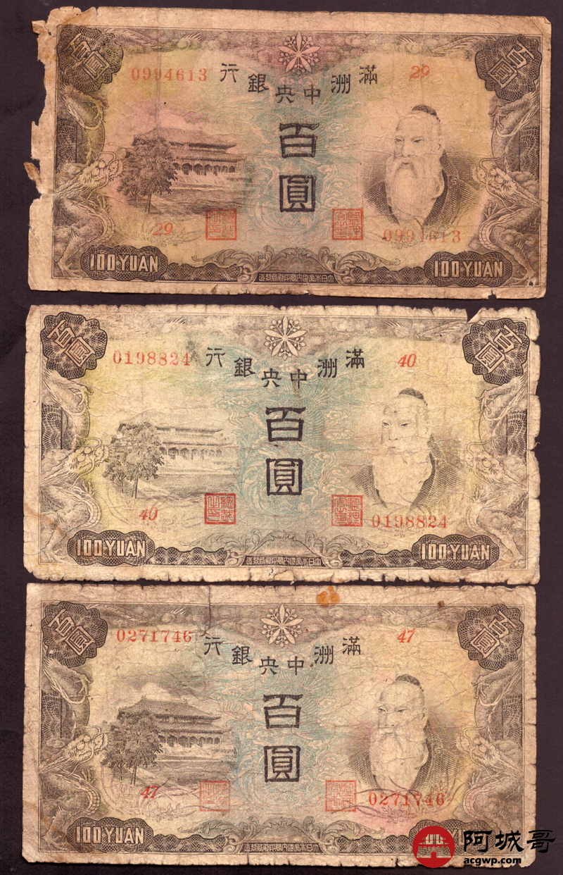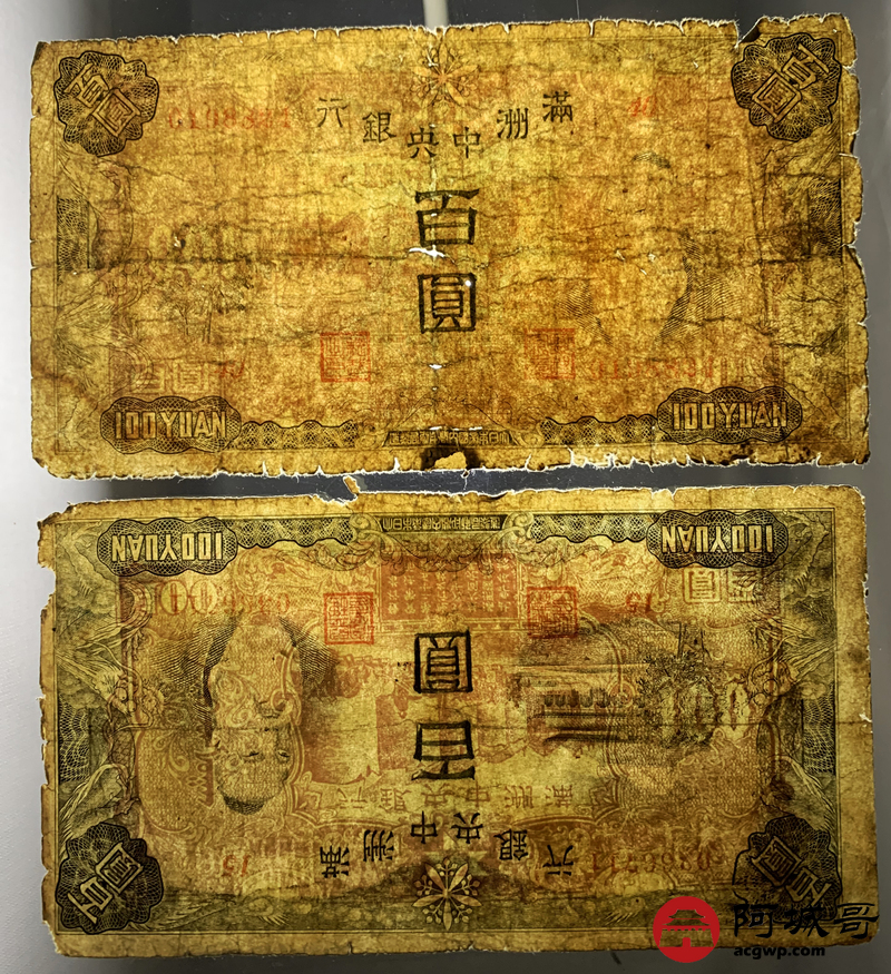 Lot:76 满洲中央银行 百圆 10张 修补 55至57成新