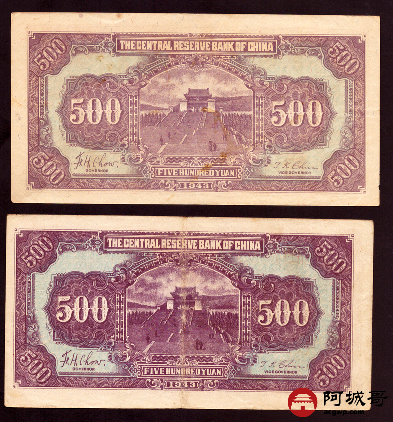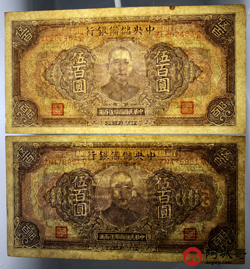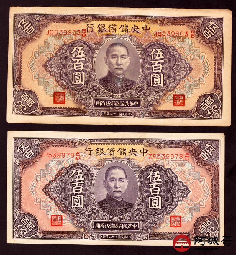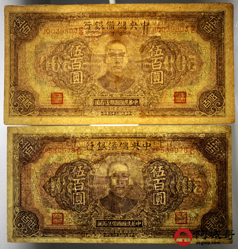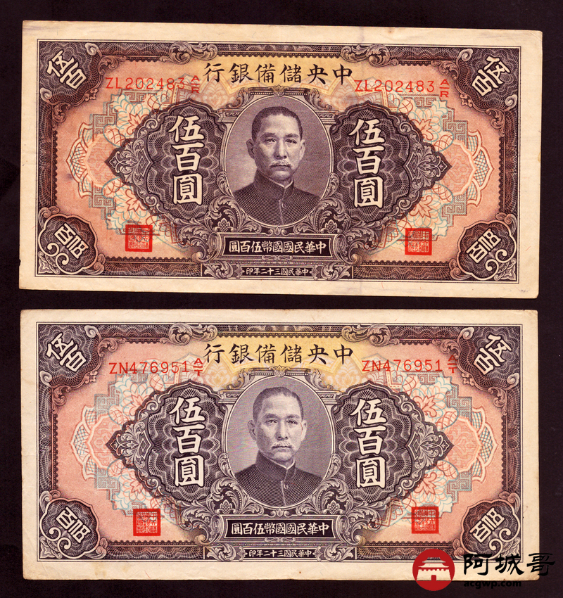 Lot:93 民国三十二年 中央储备银行 伍佰圆 4张 7至73成新