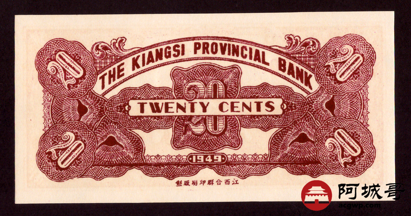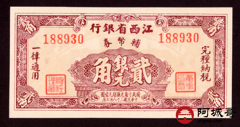 Lot:77 民国三十八年 江西省银行 辅币券贰角 原票全新