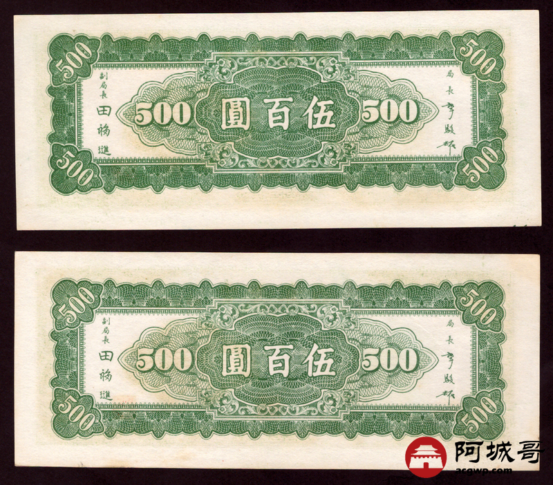 Lot:87 民国三十五年 中央银行 伍佰圆 2张连号 原票9至94成新