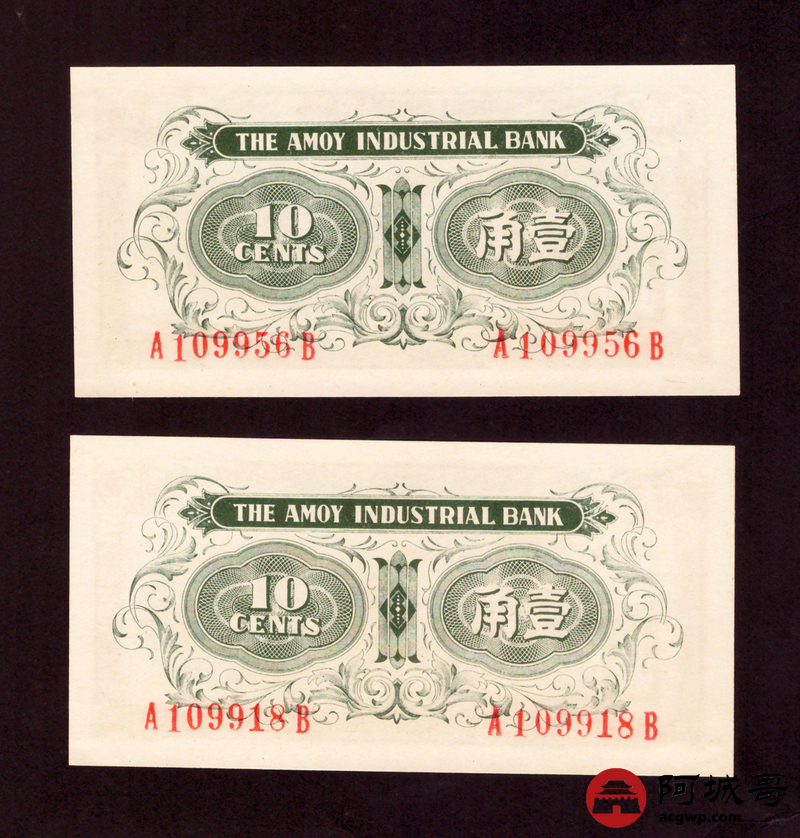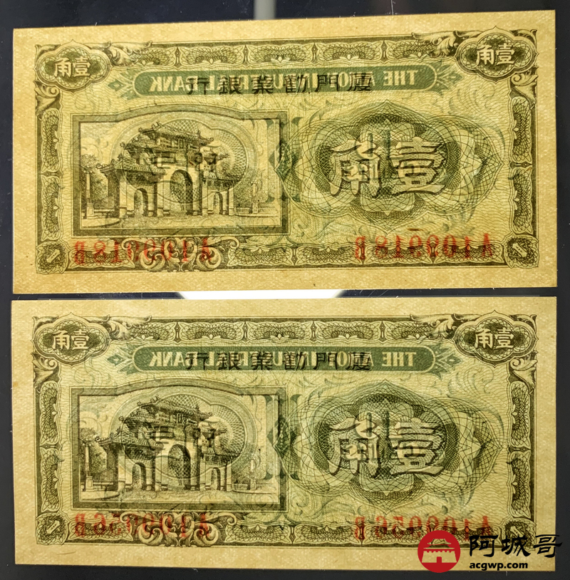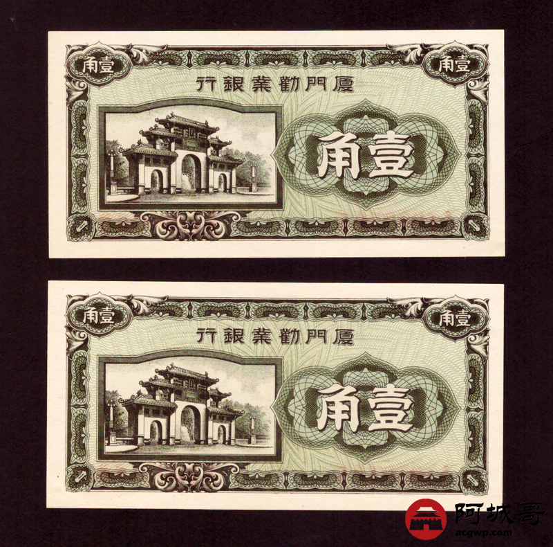 Lot:80 厦门劝业银行 壹角 2张 原票94成新 一张倒置号