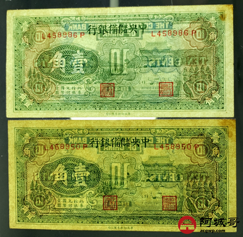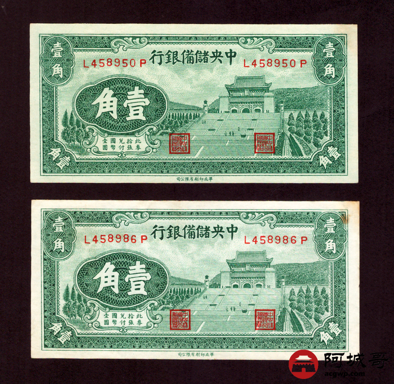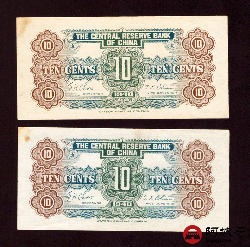 Lot:88 1940年 中央储备银行 壹角 2张 原票85至9成新