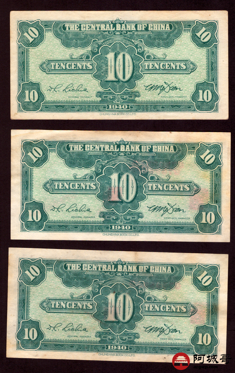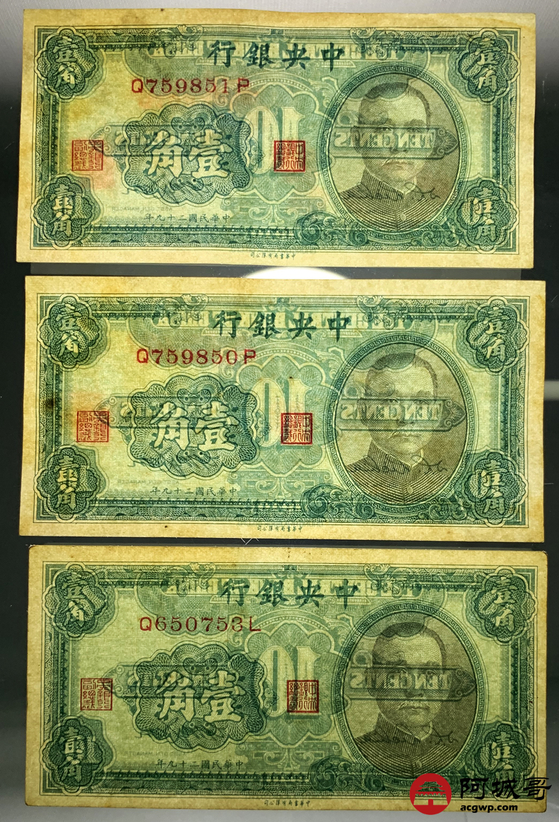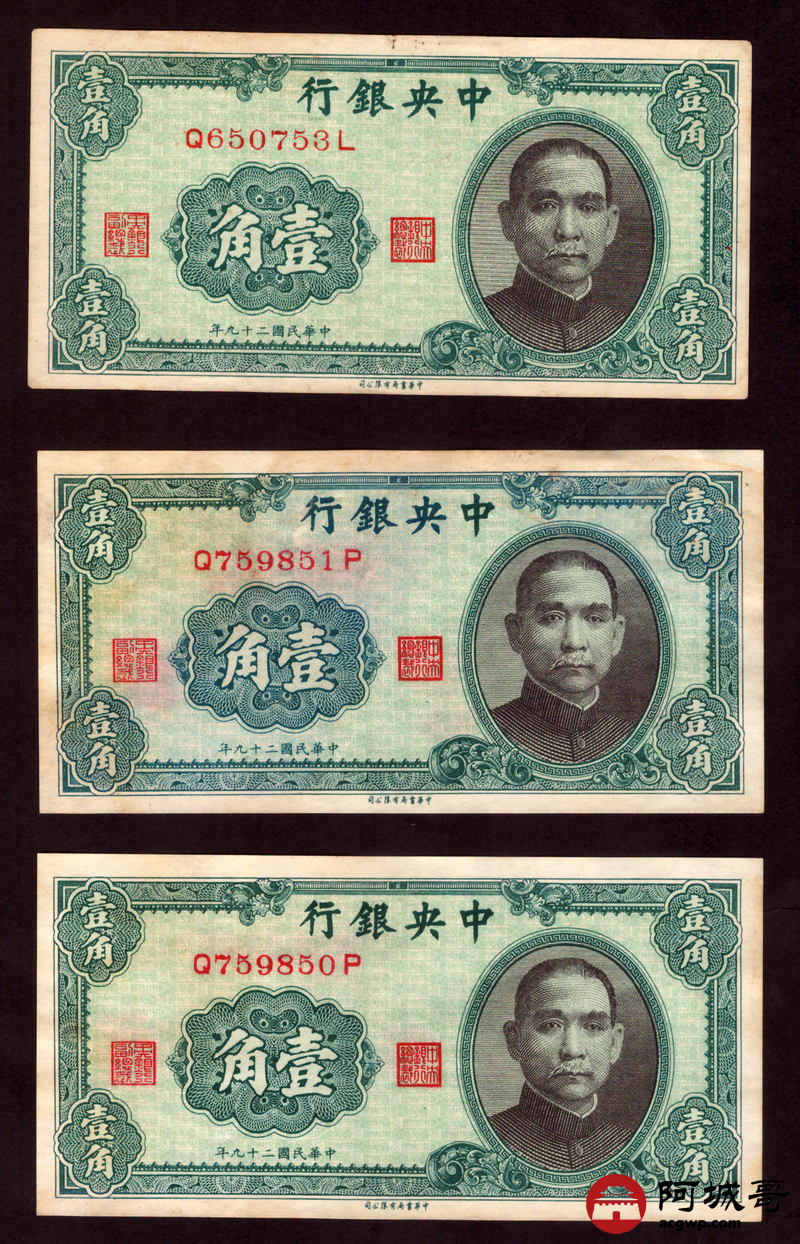 Lot:78 民国二十九年 中央银行 壹角 3张 8至85成新