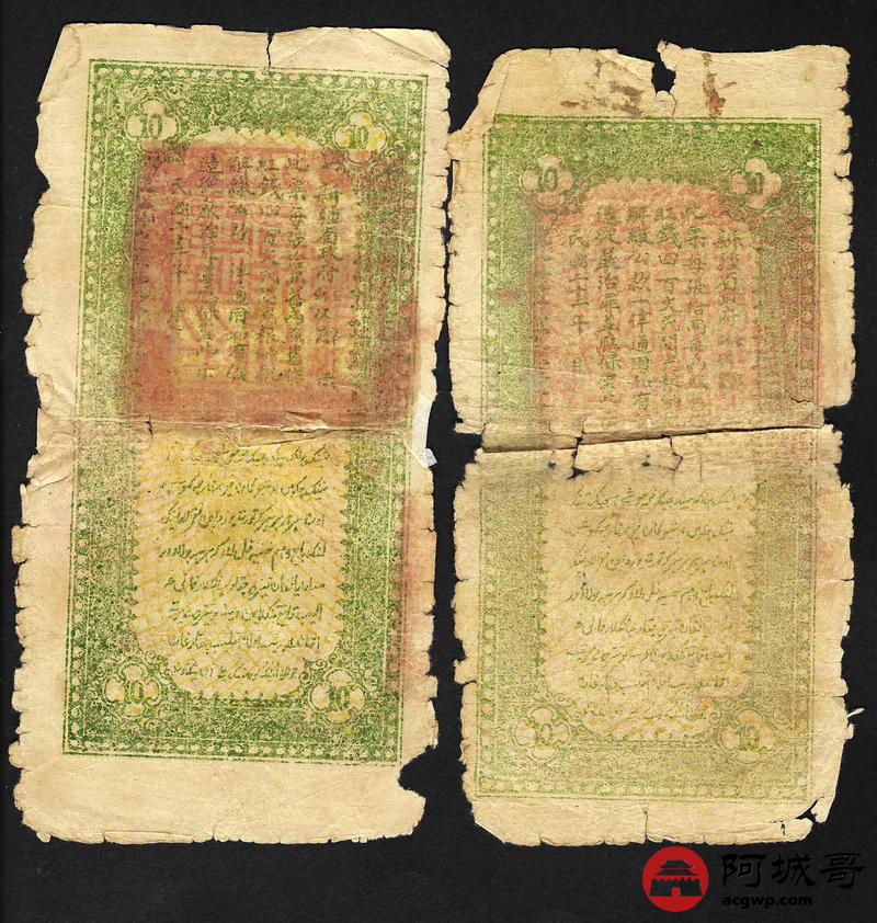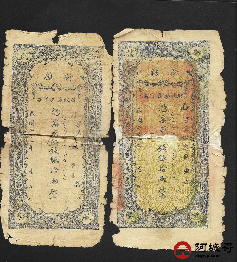 Lot:86 新疆财政厅库官票 红钱拾两整 2张 修补 5至55成新