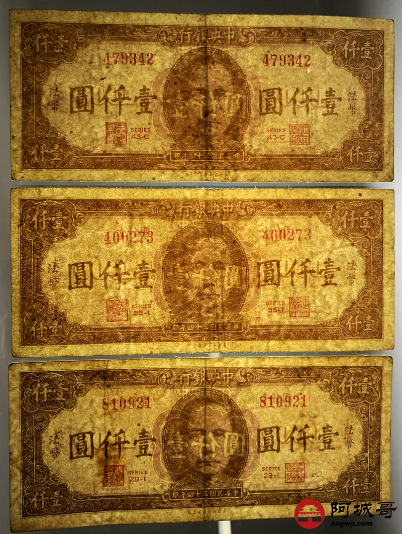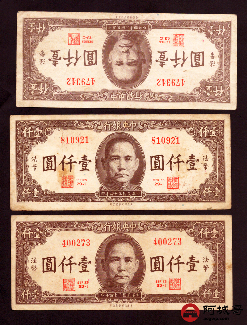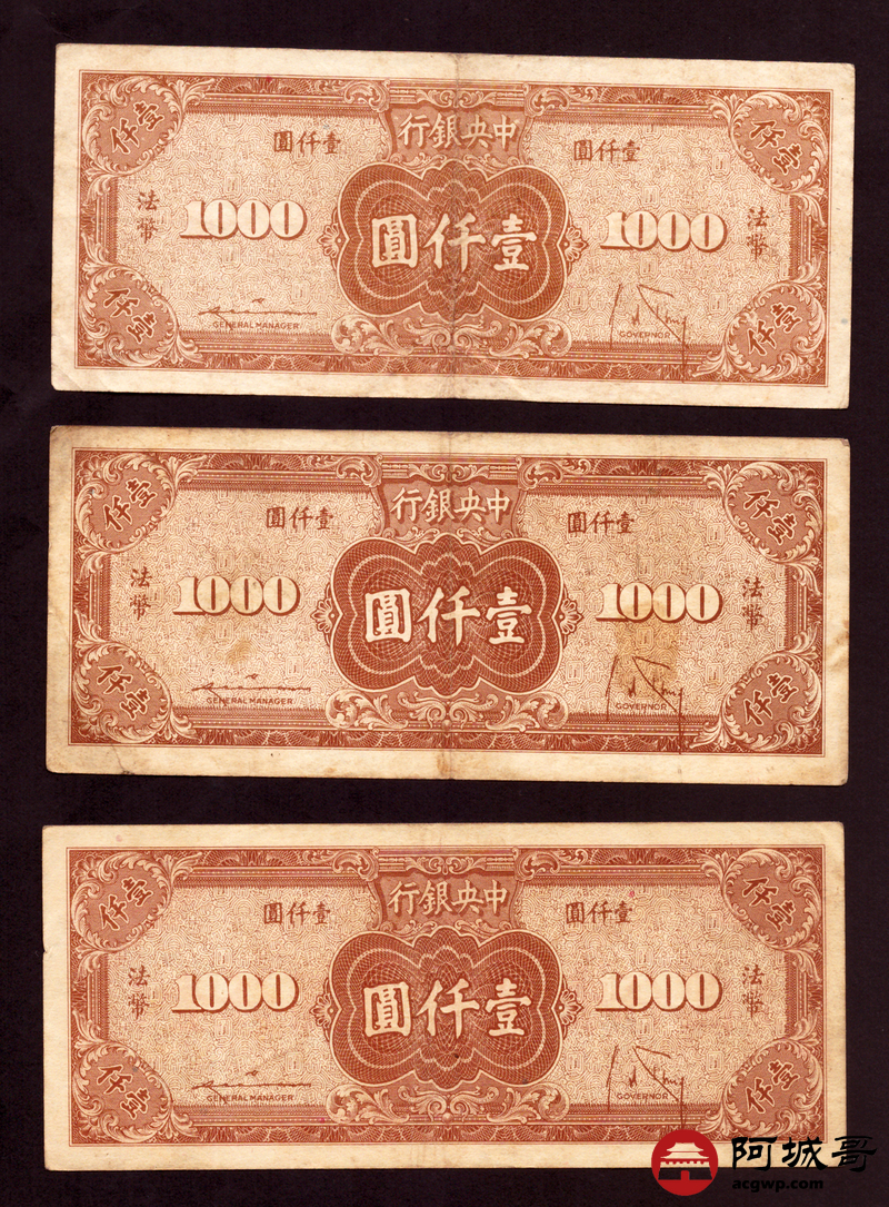 Lot:36 民国三十四年 中央银行 壹仟圆 3张 板子硬7至72成新