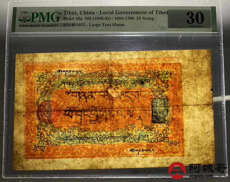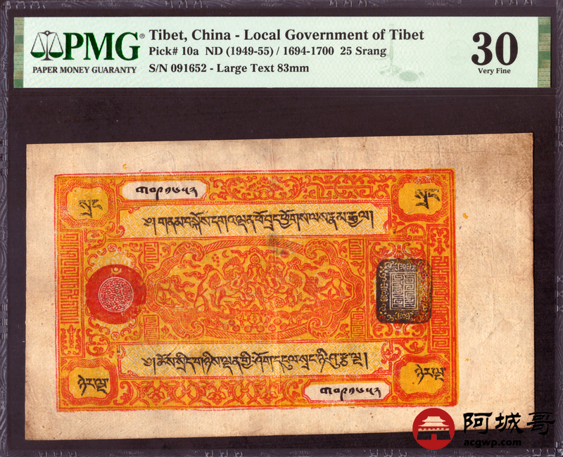 Lot:33 西藏老纸币 25两 PMG 30 品相自然