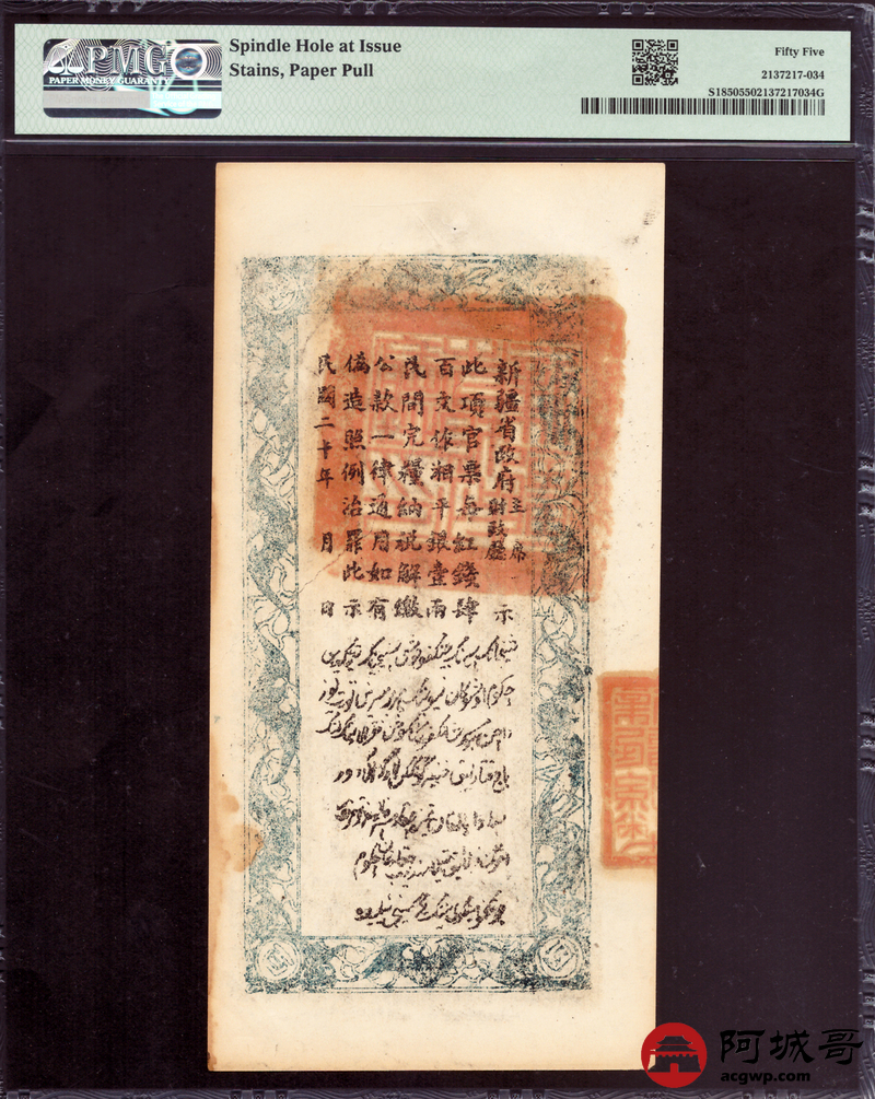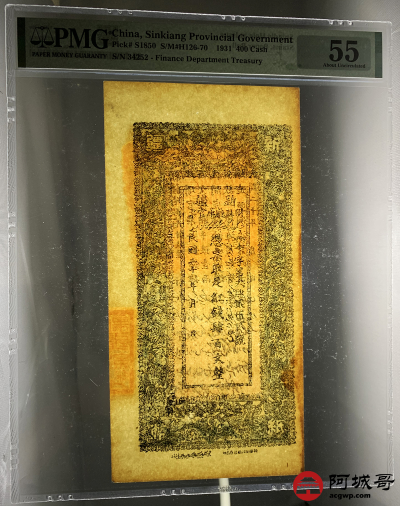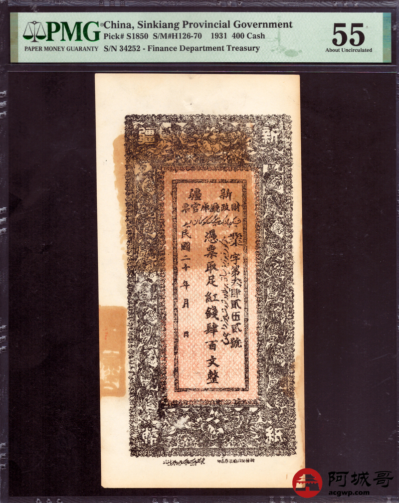 Lot:23 民国二十年 新疆财政厅库官票 红钱肆佰文整 PMG 55
