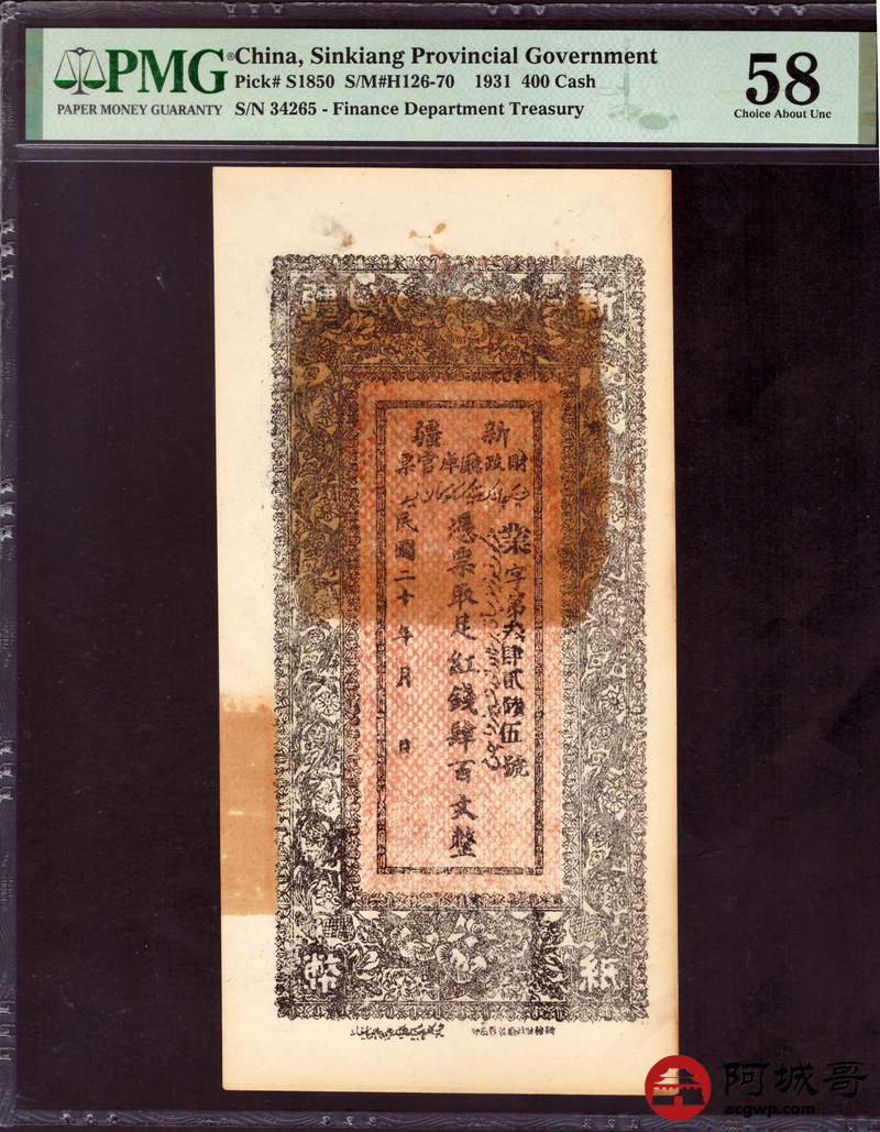Lot:22 民国二十年 新疆财政厅库官票 红钱肆佰文整 PMG 58