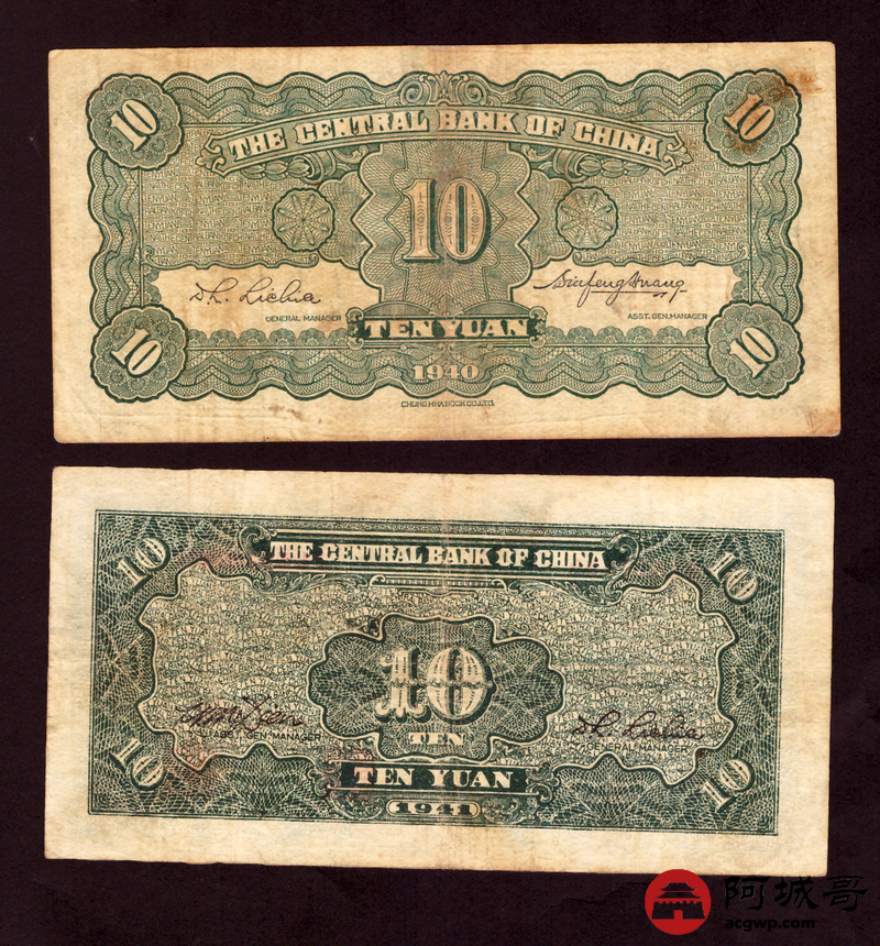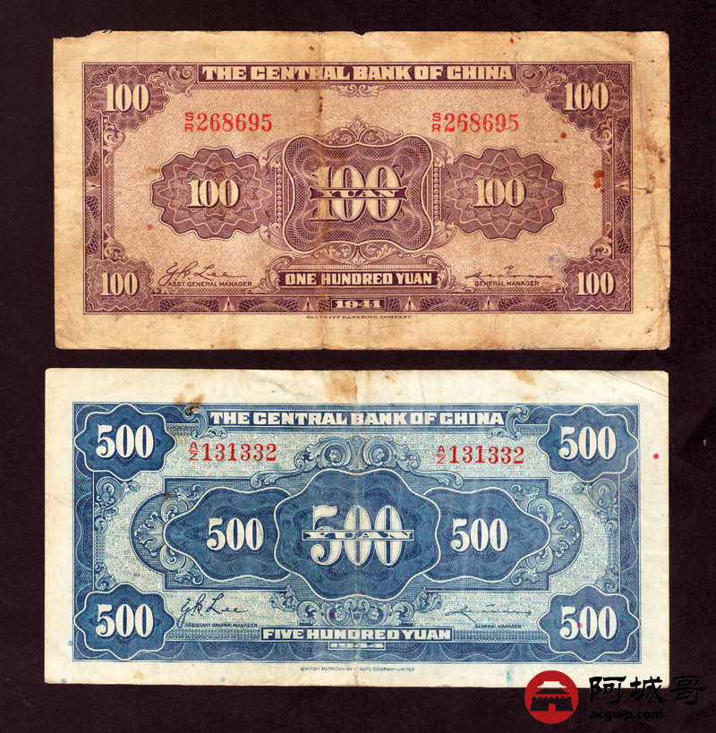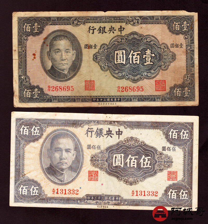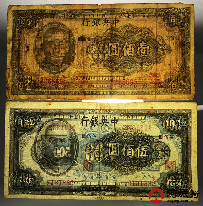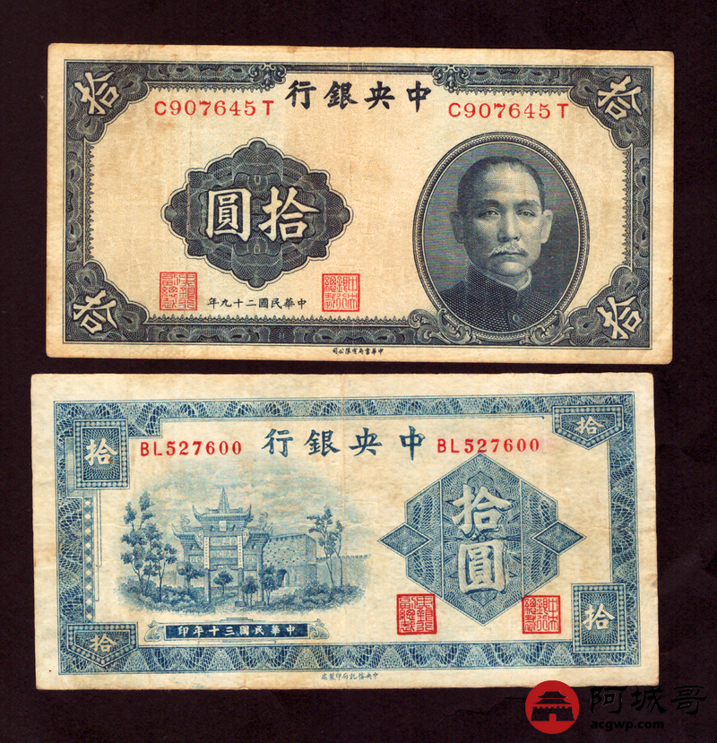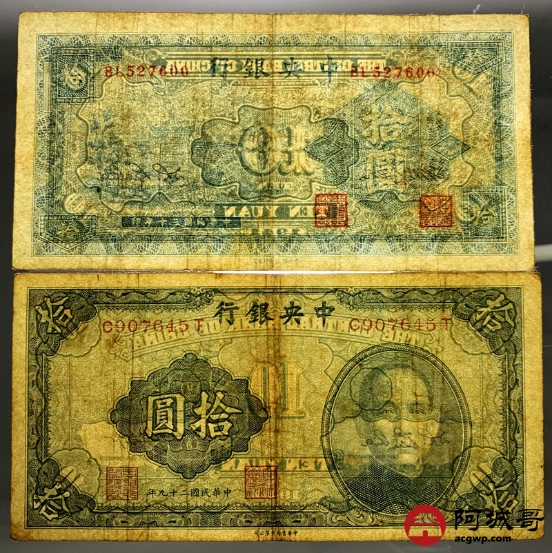 Lot:1 民国时期中央银行各种面值纸币4张 68至7成新