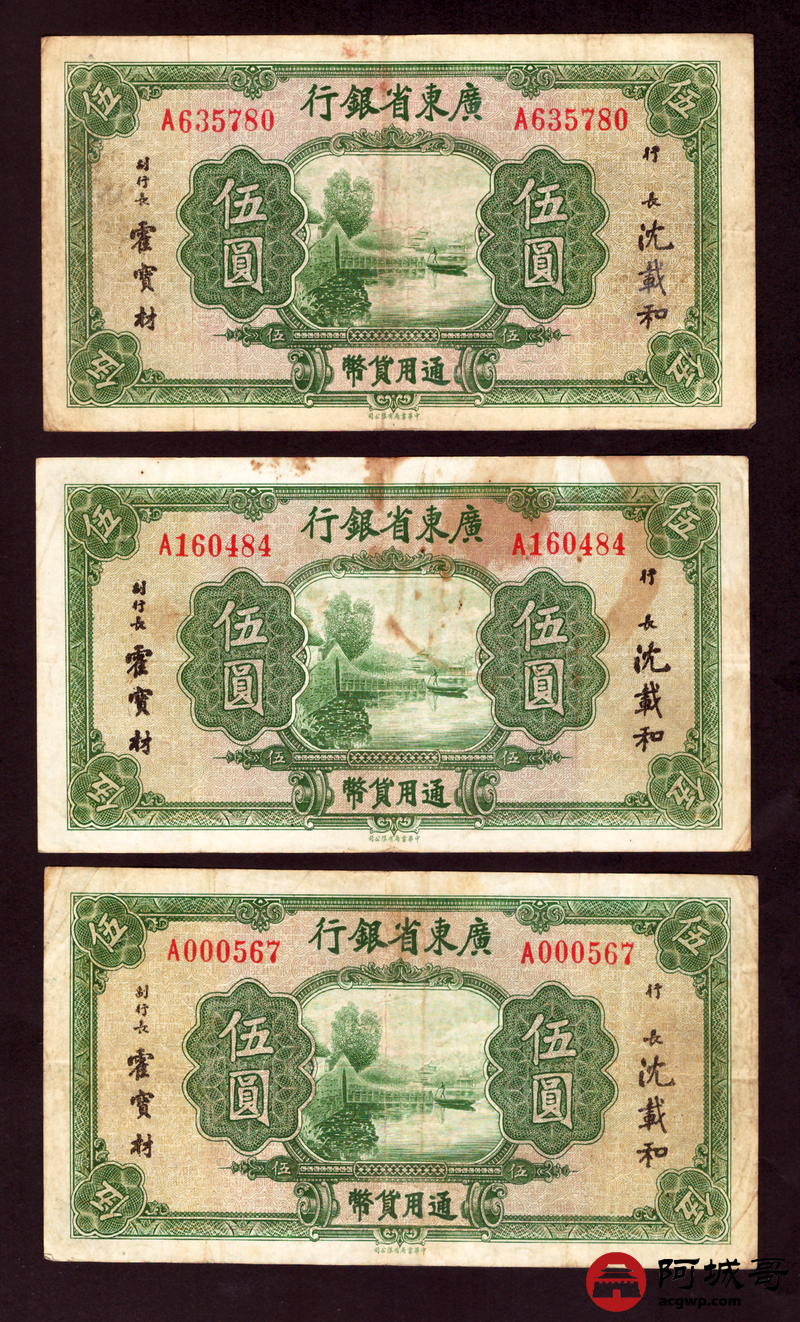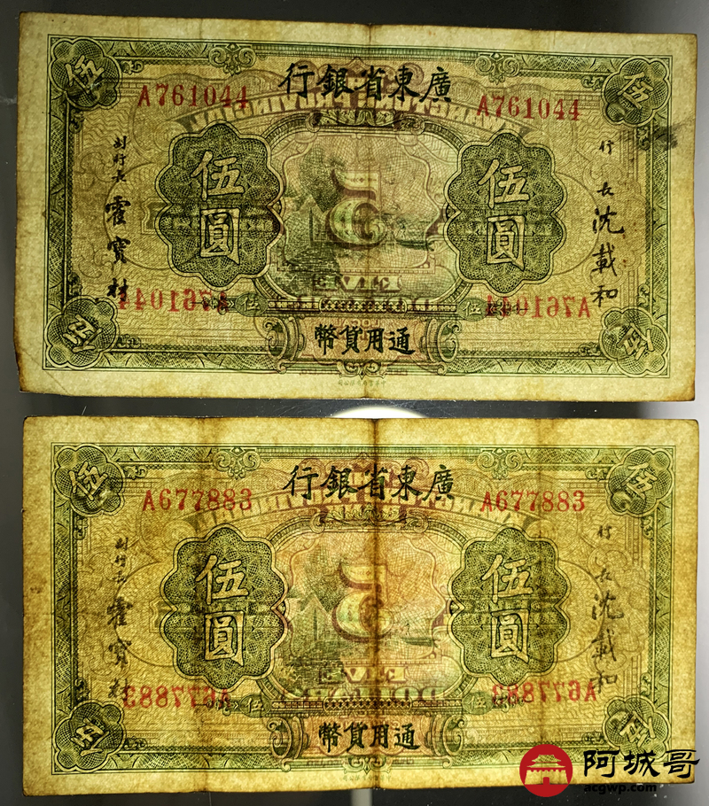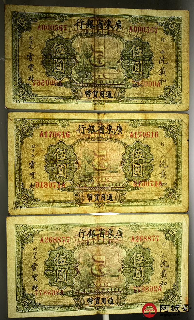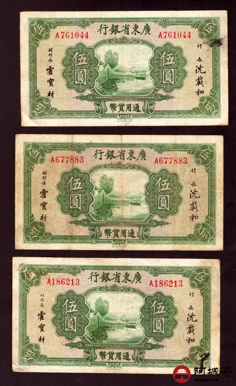 Lot:19 广东省银行 伍圆 8张 孔 69成新