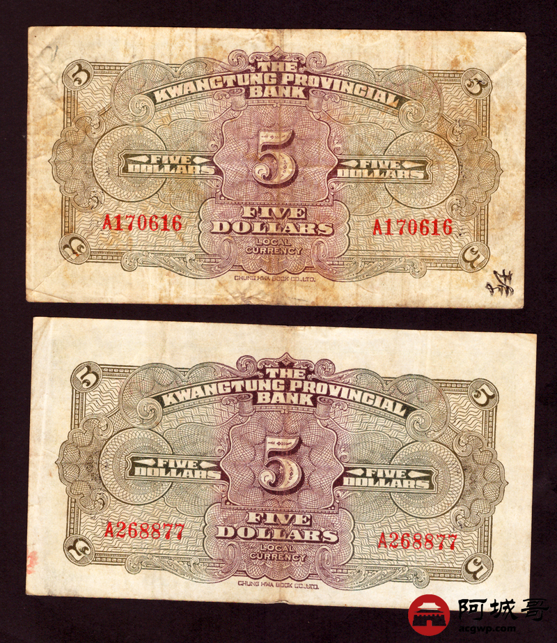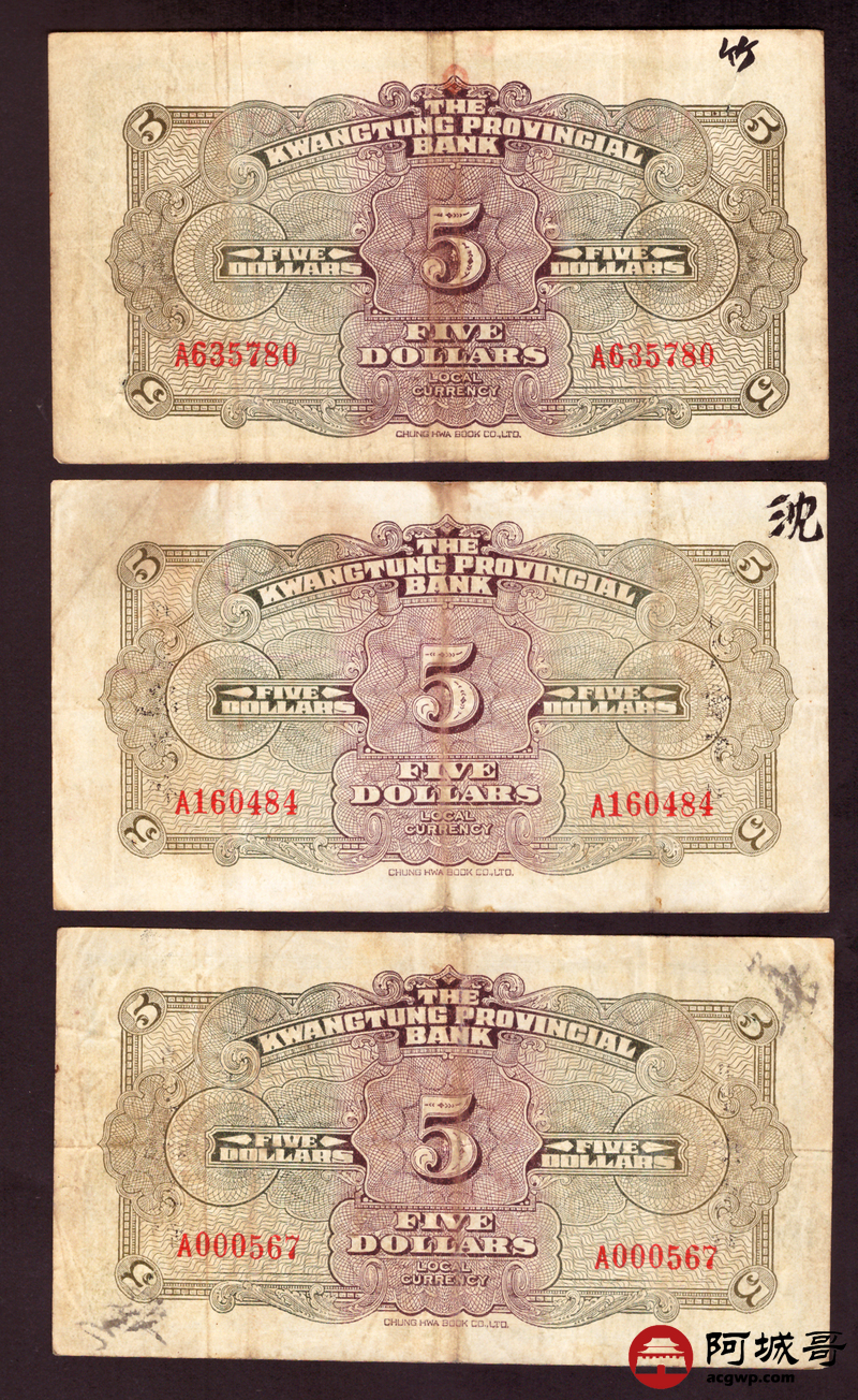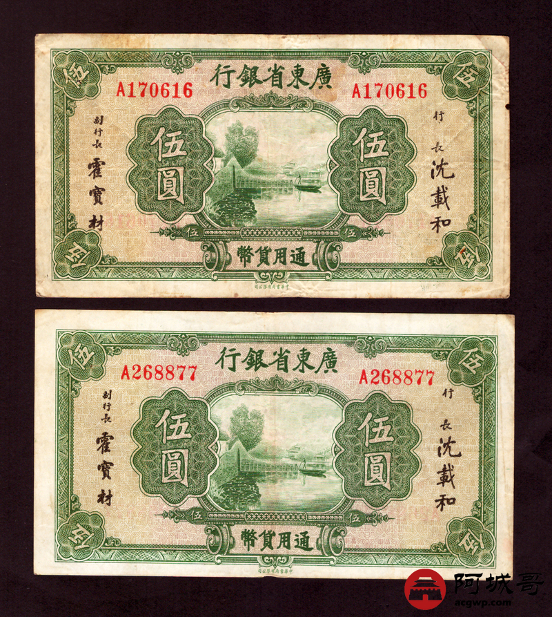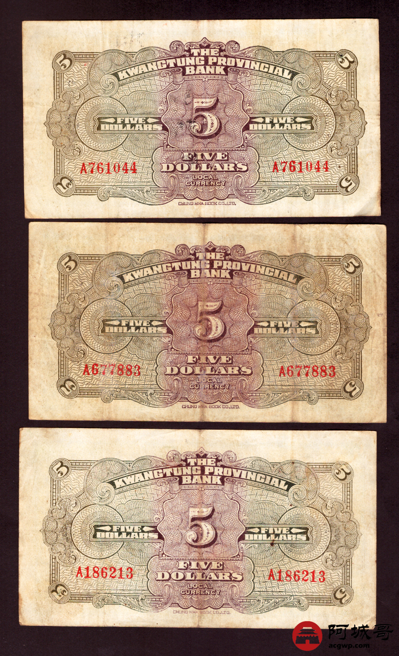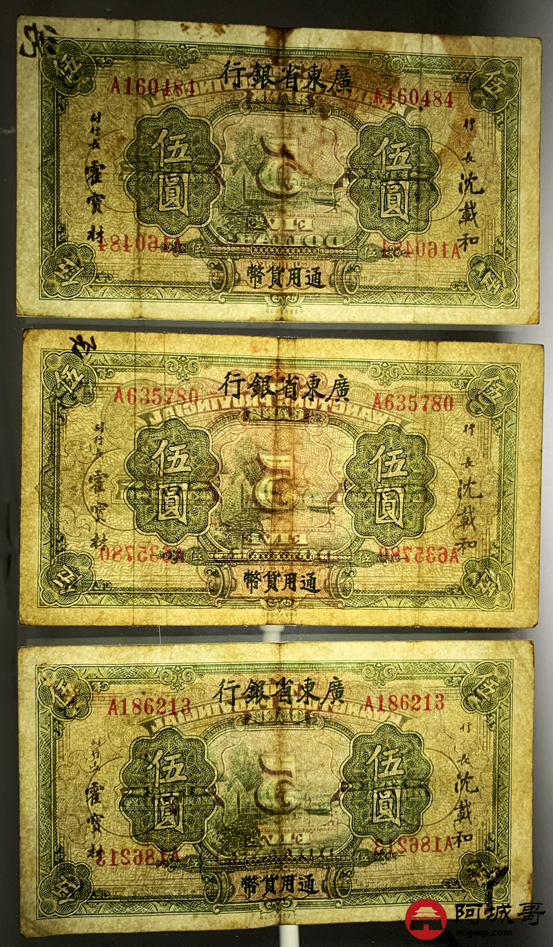 Lot:19 广东省银行 伍圆 8张 孔 69成新
