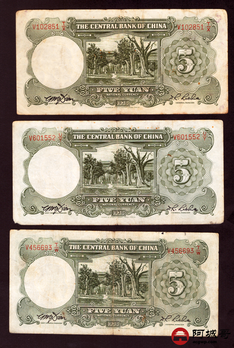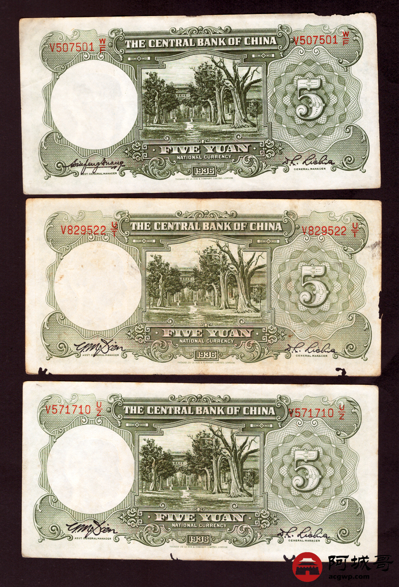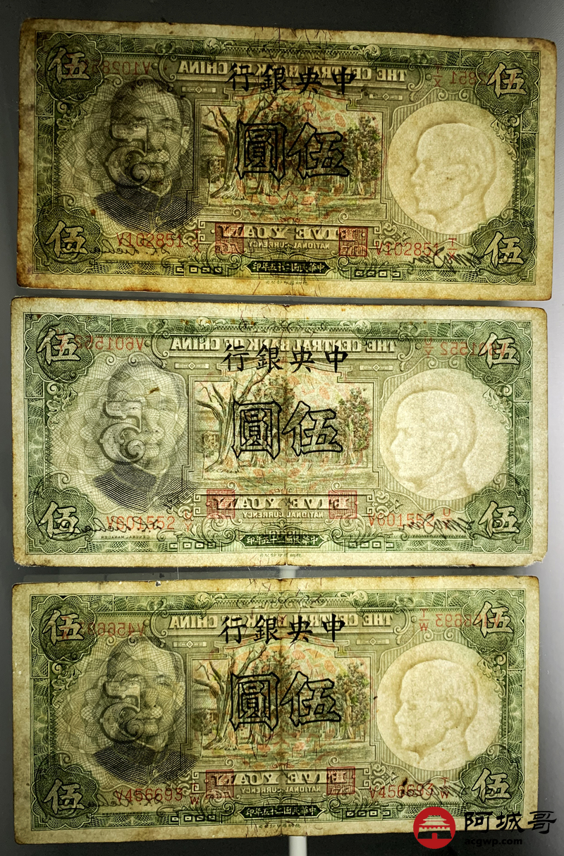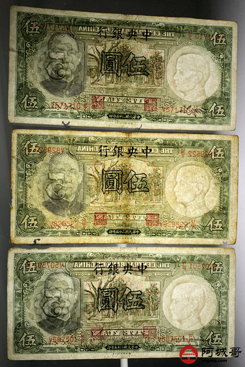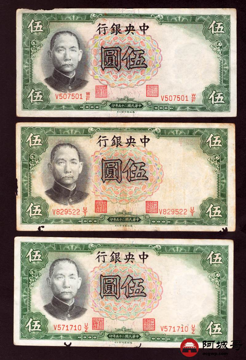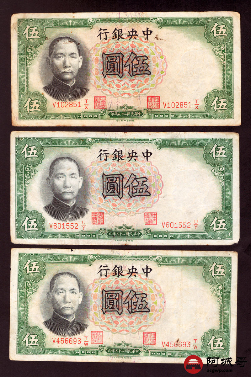 Lot:18 民国二十五年 中央银行 伍圆 6张 68至69成新