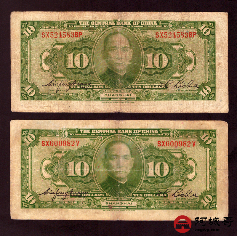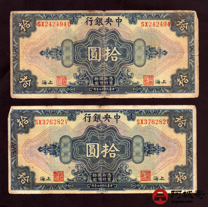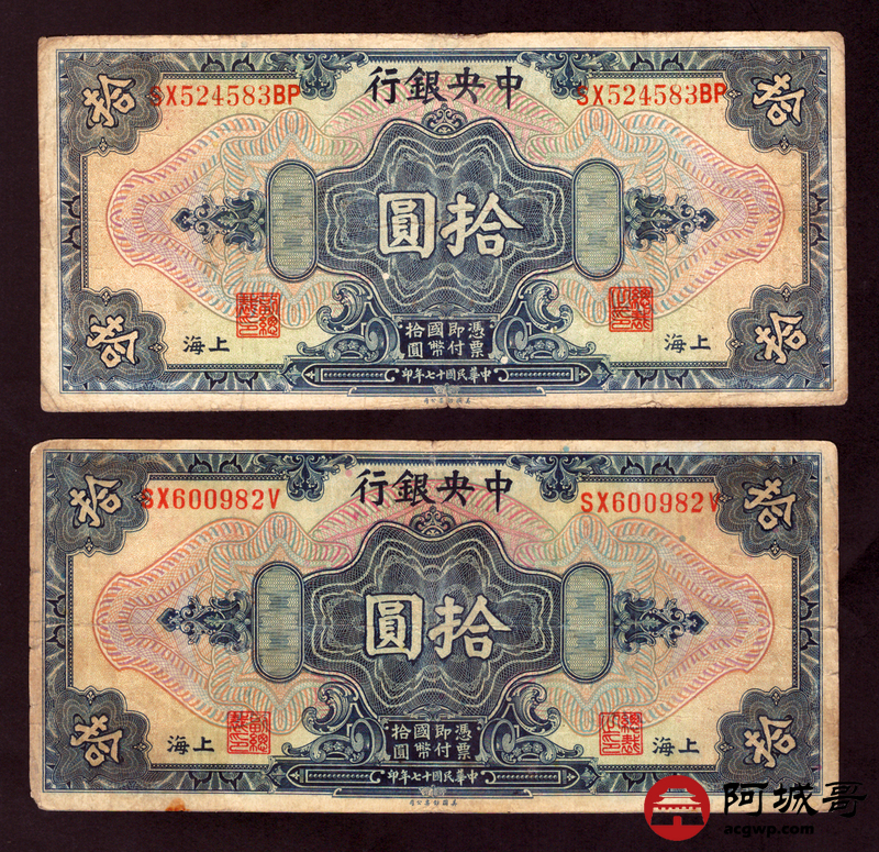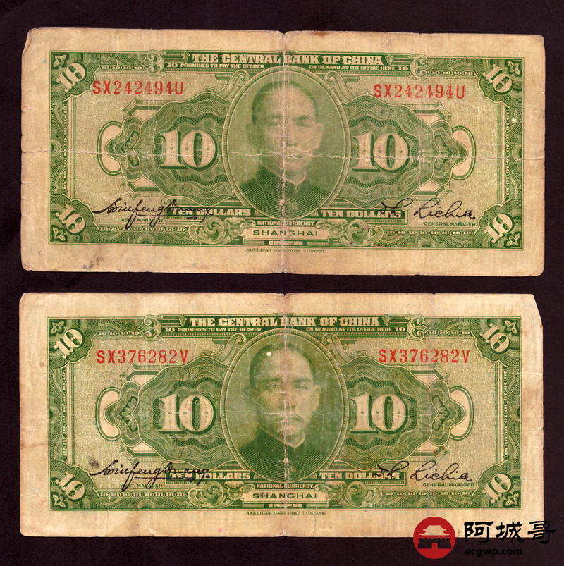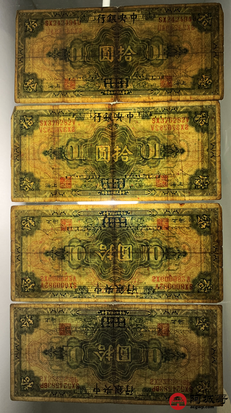 Lot:15 民国十七年 中央银行 拾圆 4张 68至69成新