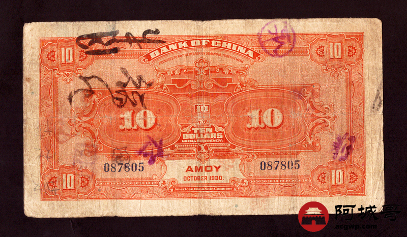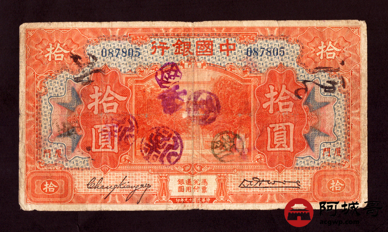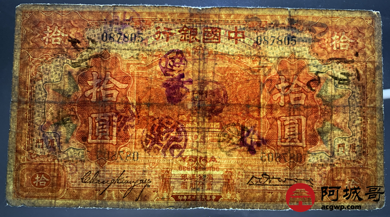 Lot:31 民国十九年 中国银行 拾圆 厦门地名 68至69成新