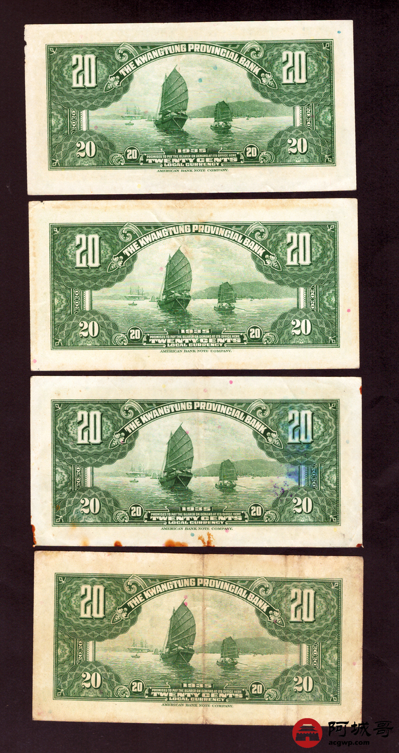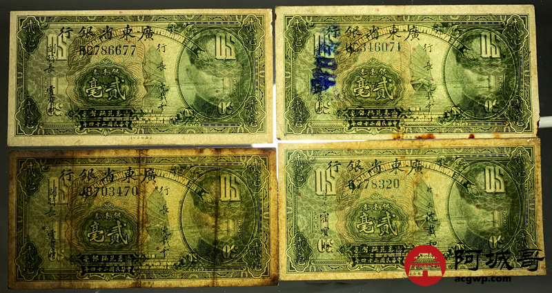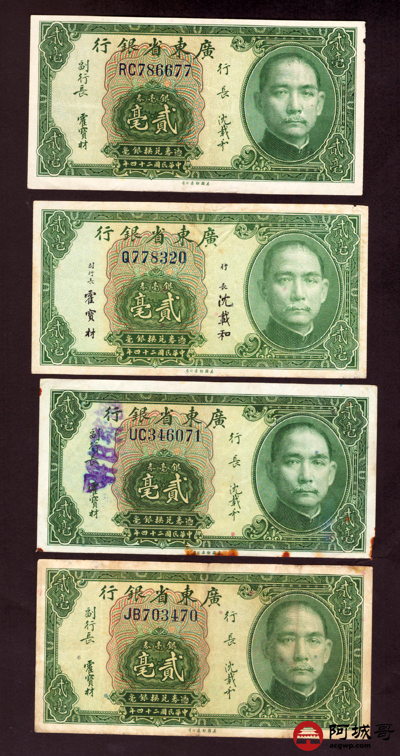 Lot:39 民国二十四年 广东省银行 贰毫 4张 69成新