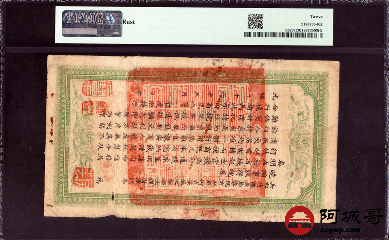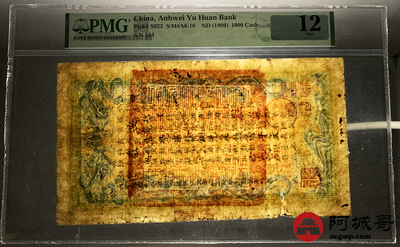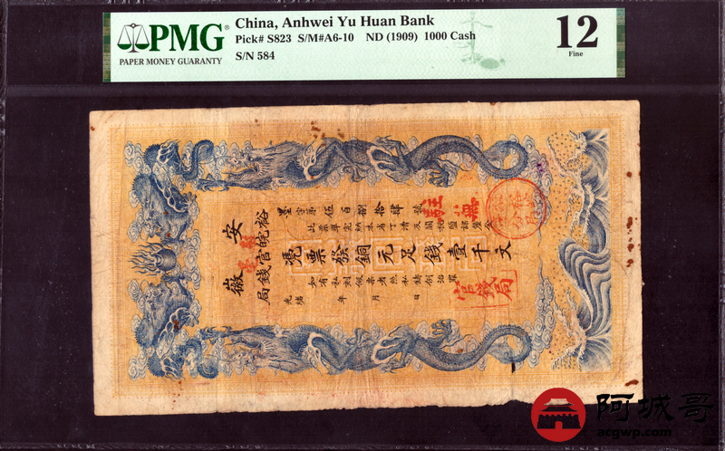 Lot:9 光绪三十二年(1909年)安徽裕皖官钱局 铜元足钱壹仟文 PMG 12