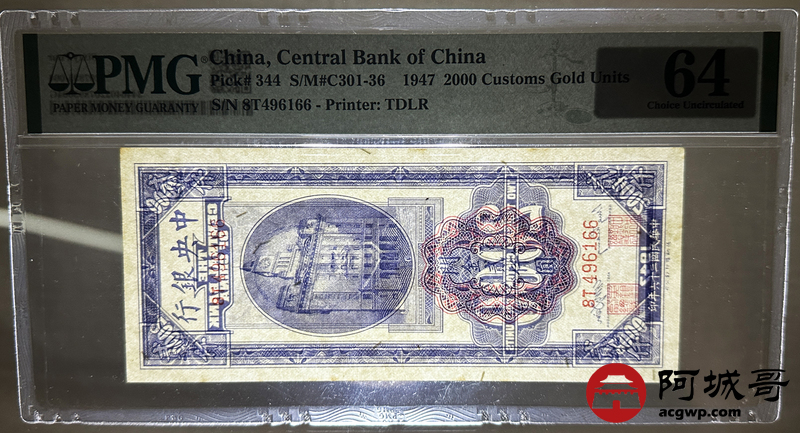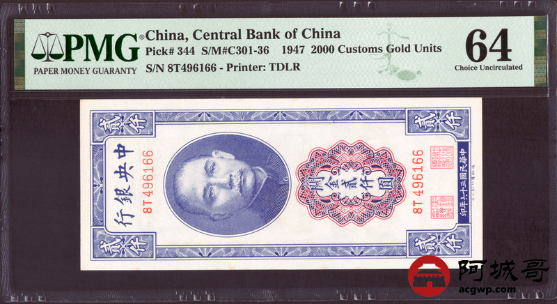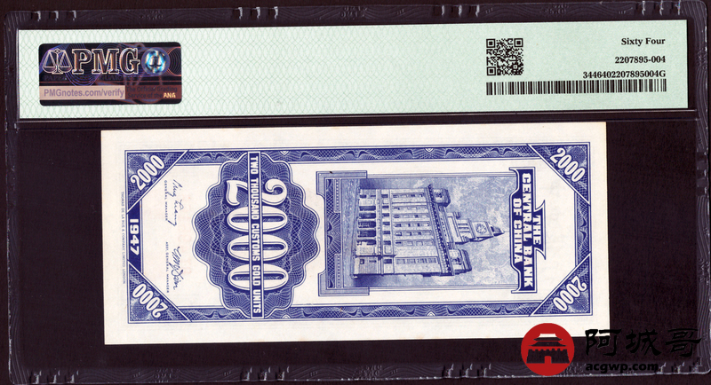 Lot:35 民国36年 中央银行 关金贰仟圆 PMG 64