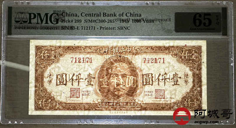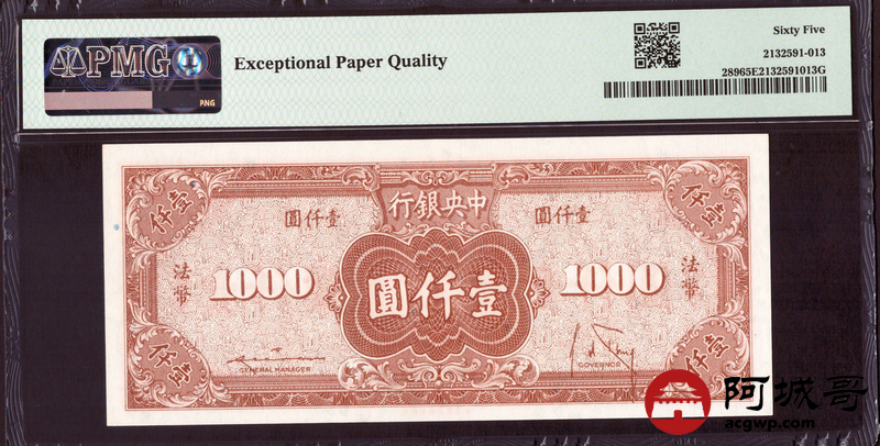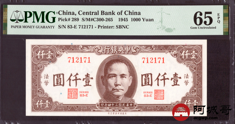 Lot:40 民国34年 中央银行 壹仟圆 PMG 65EPQ