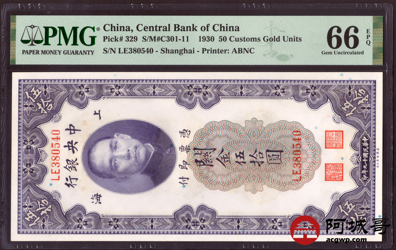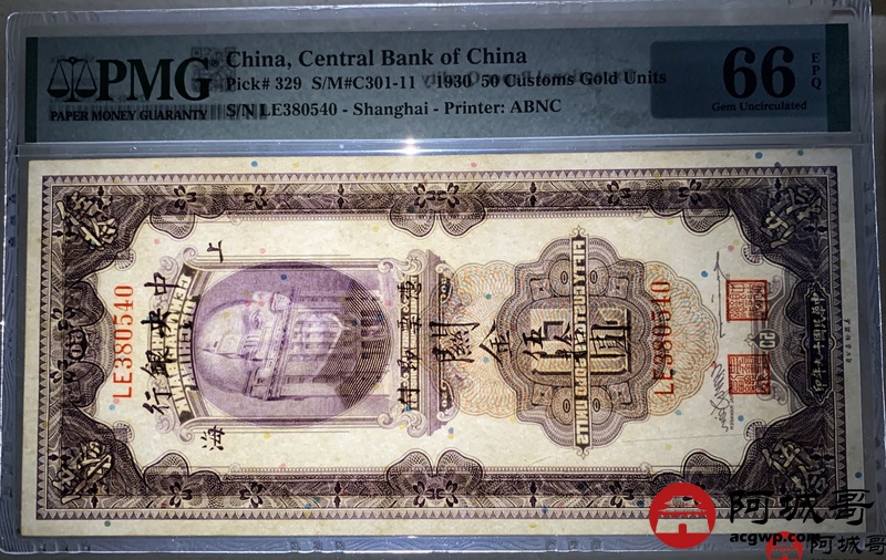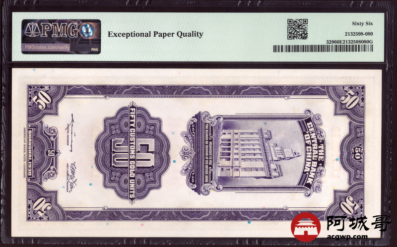 Lot:7 1930中央银行关金伍拾圆 PMG 66EPQ
