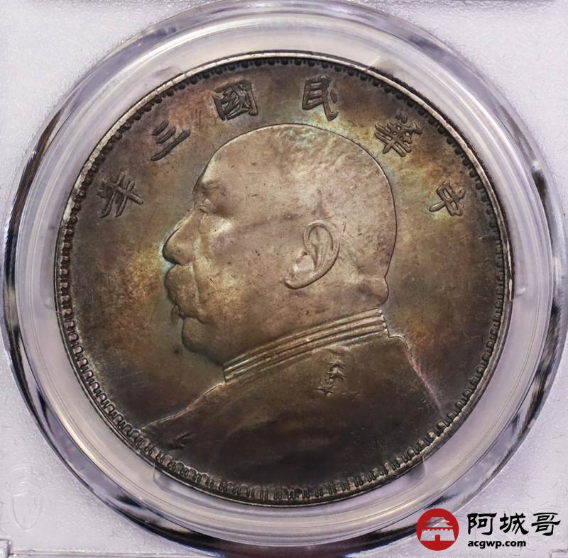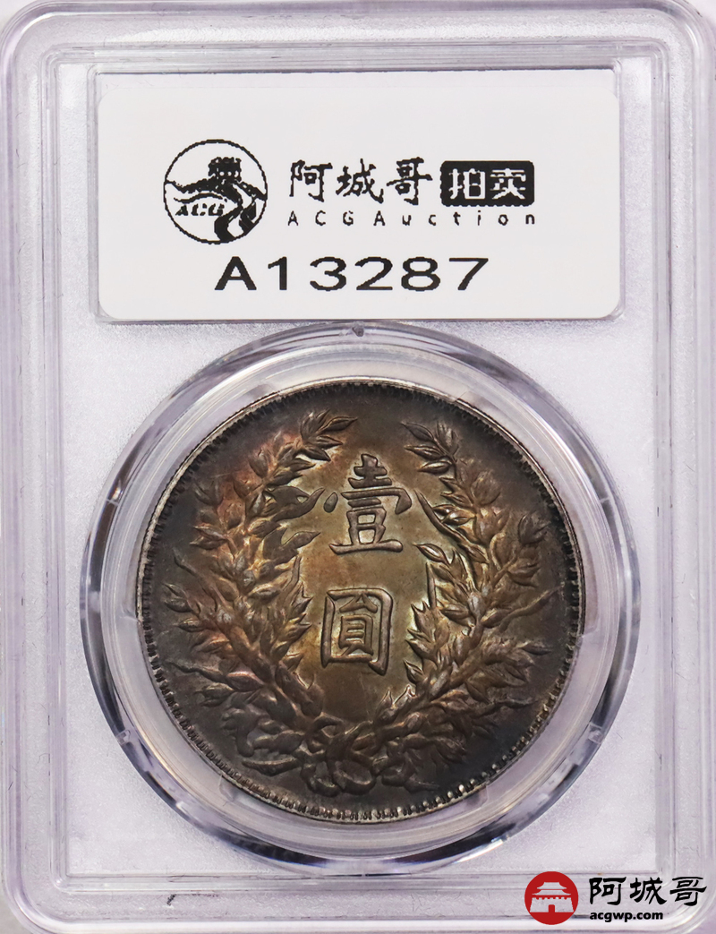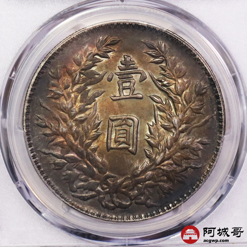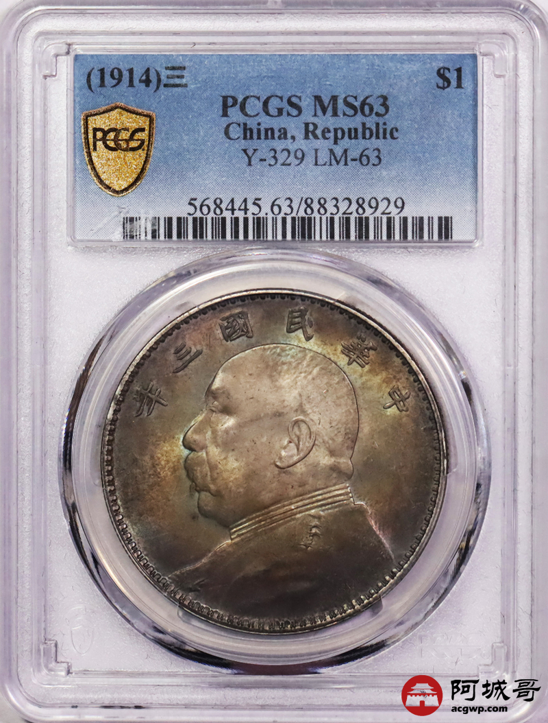 Lot:6088 1914民国三年袁世凯像壹圆银币一枚,通体酱红色老五彩,底板状态一流 PCGS MS63评级编号:88328929