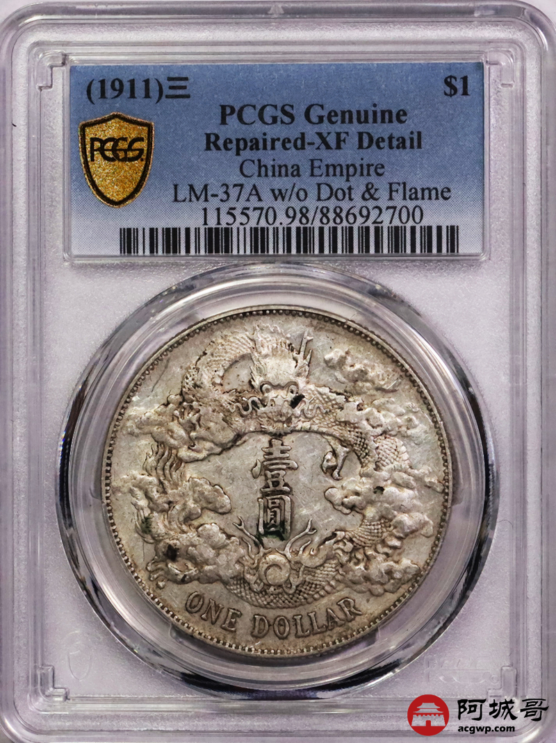Lot:6040 1911宣统三年大清壹圆银币一枚,原味包浆PCGS XF98评级编号:88692700
