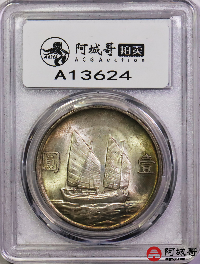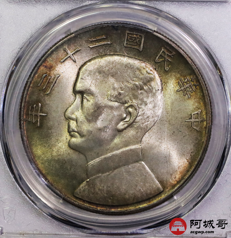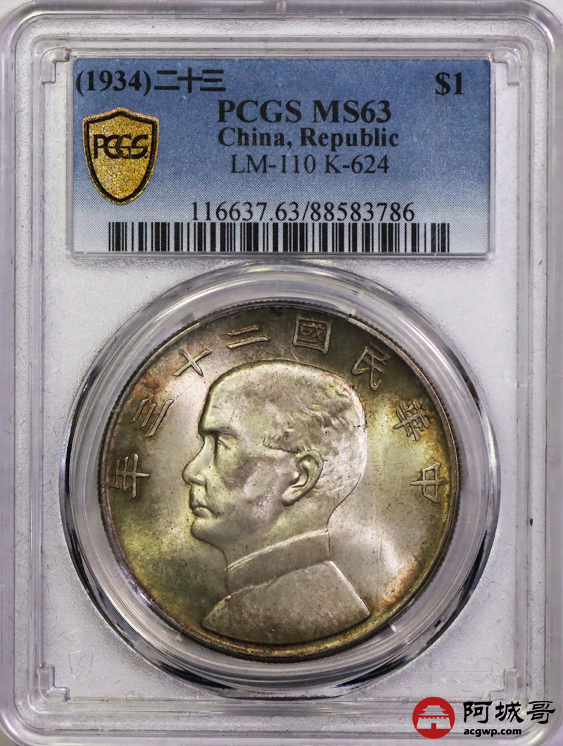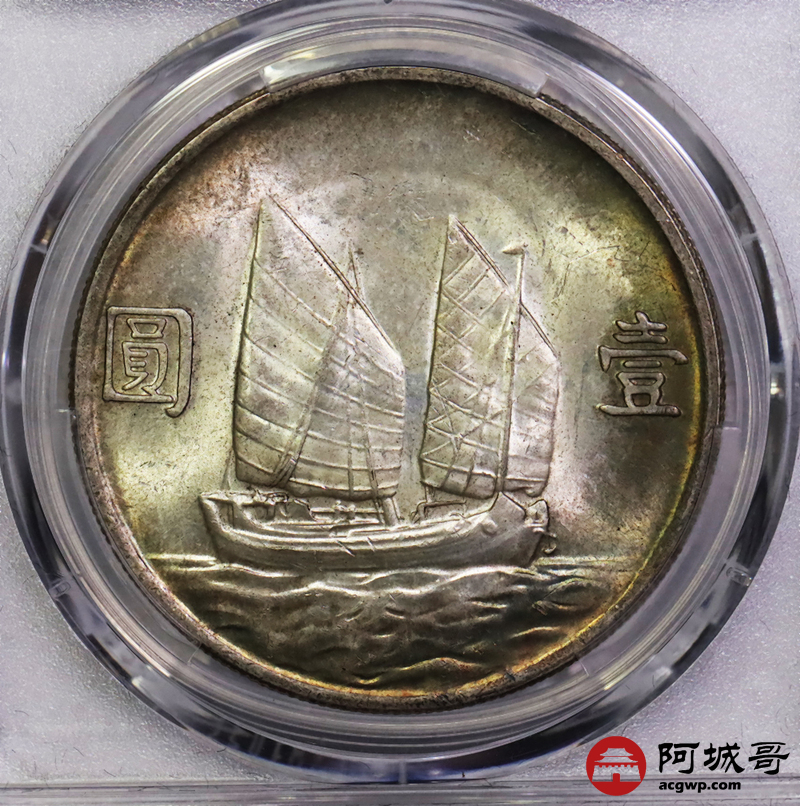 Lot:6120 1934民国二十三年孙中山像背帆船壹圆银币一枚,黄油五彩包浆PCGS MS63评级编号:88583786