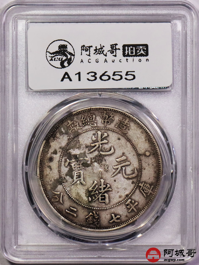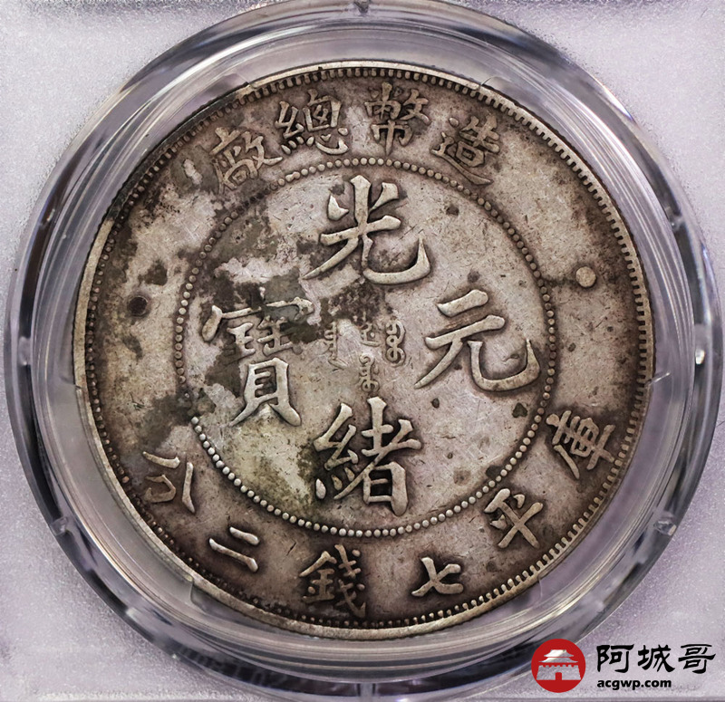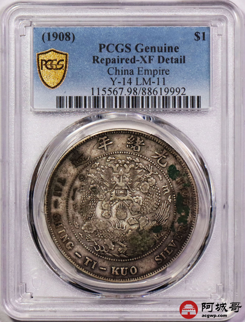 Lot:6007 1908光绪年造造币总厂光绪元宝库平七钱二分银币一枚,原味包浆PCGS XF98评级编号:88619992