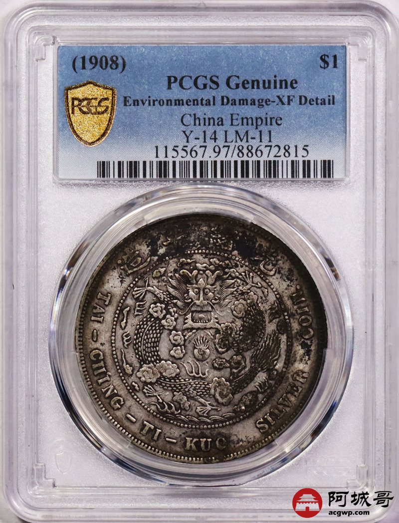 Lot:6002 1908光绪年造造币总厂光绪元宝库平七钱二分银币一枚,原味包浆PCGS XF97评级编号:88672815