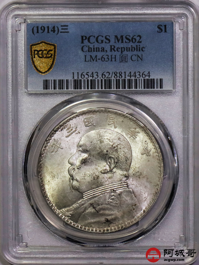 Lot:6559 1914民国三年袁世凯像壹圆银币一枚,原色光 PCGS MS62评级编号:88144364