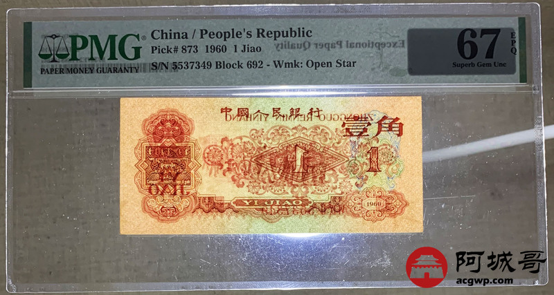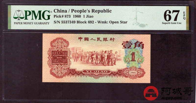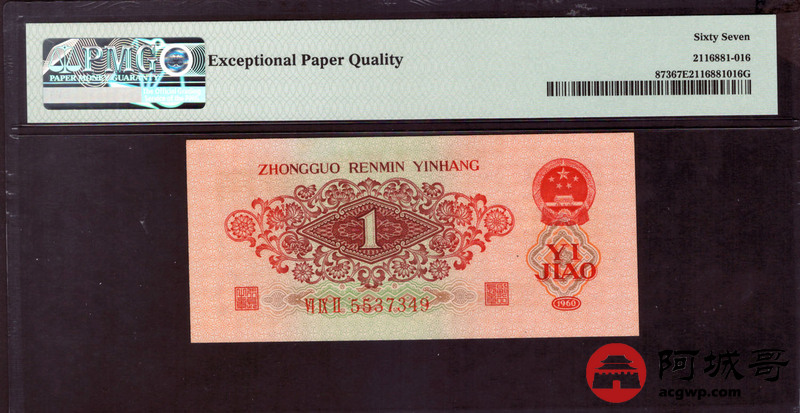 Lot:9 三版 1960年 枣红壹角 三版珍品 PMG 67EPQ