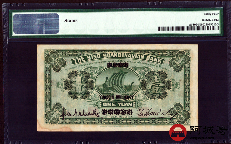 Lot:11 民国11年 华威银行 壹圆 加盖昌黎 PMG 64