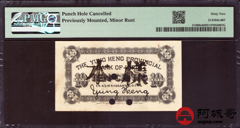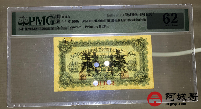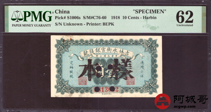 Lot:45 民国7年 吉林永衡官银钱号 壹角 哈尔滨地名 实票改样票 PMG 62