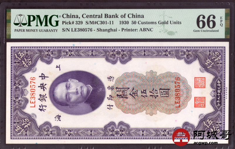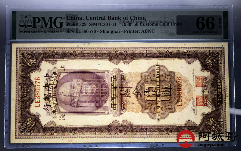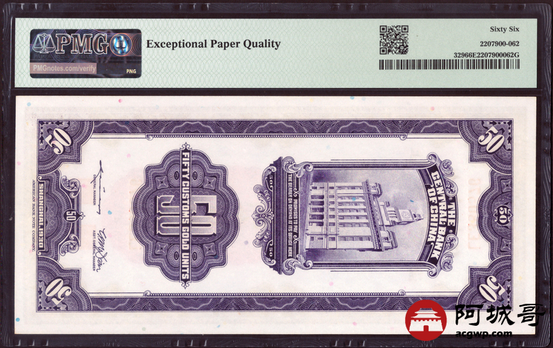 Lot:10 民国十九年 中央银行 关金伍拾圆 上海地名 PMG 66EPQ