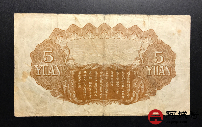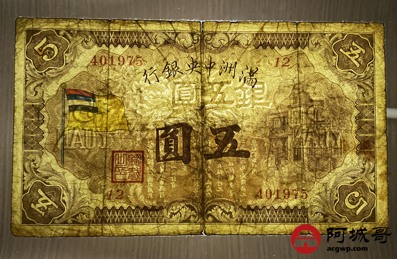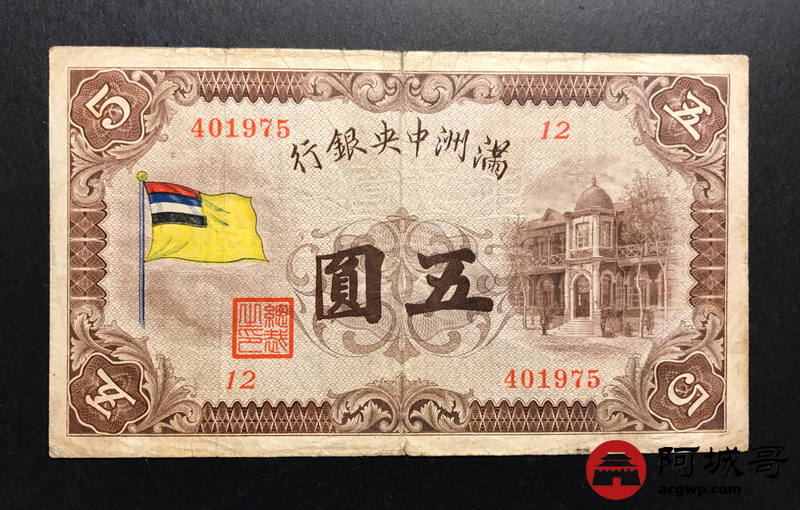 Lot:30 满洲中央银行 五色旗 伍圆 原票 色泽亮丽 68成新