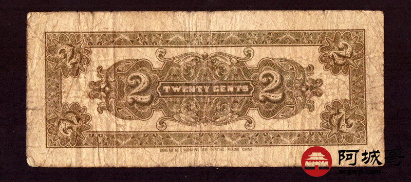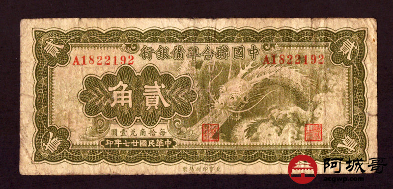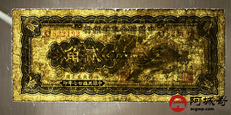 Lot:3 民国27年 中国联合准备银行 贰角 67成新