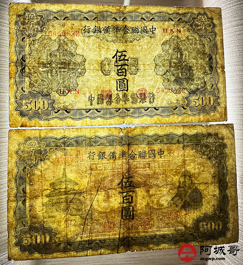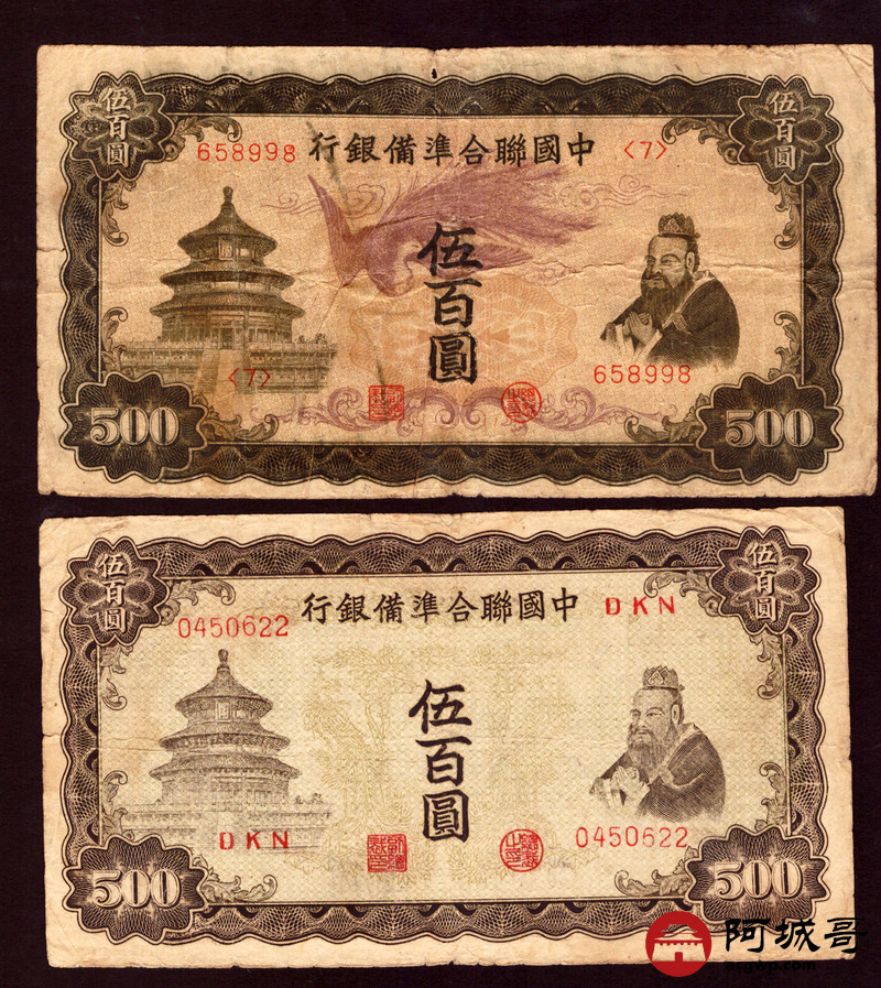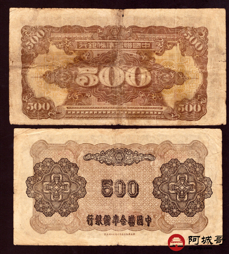 Lot:57 中国联合准备银行 伍佰圆 两张 68成新、69成新