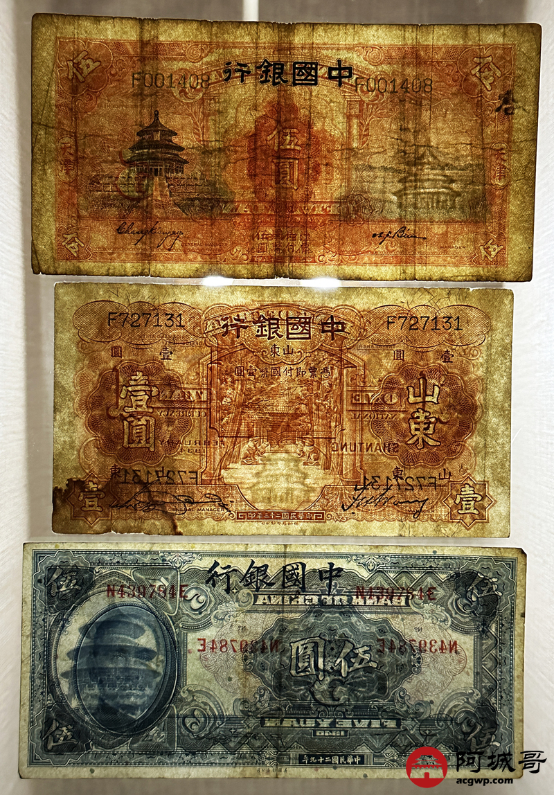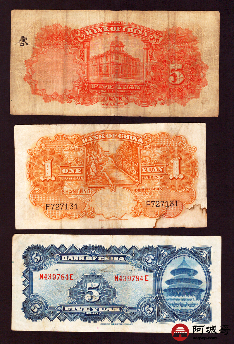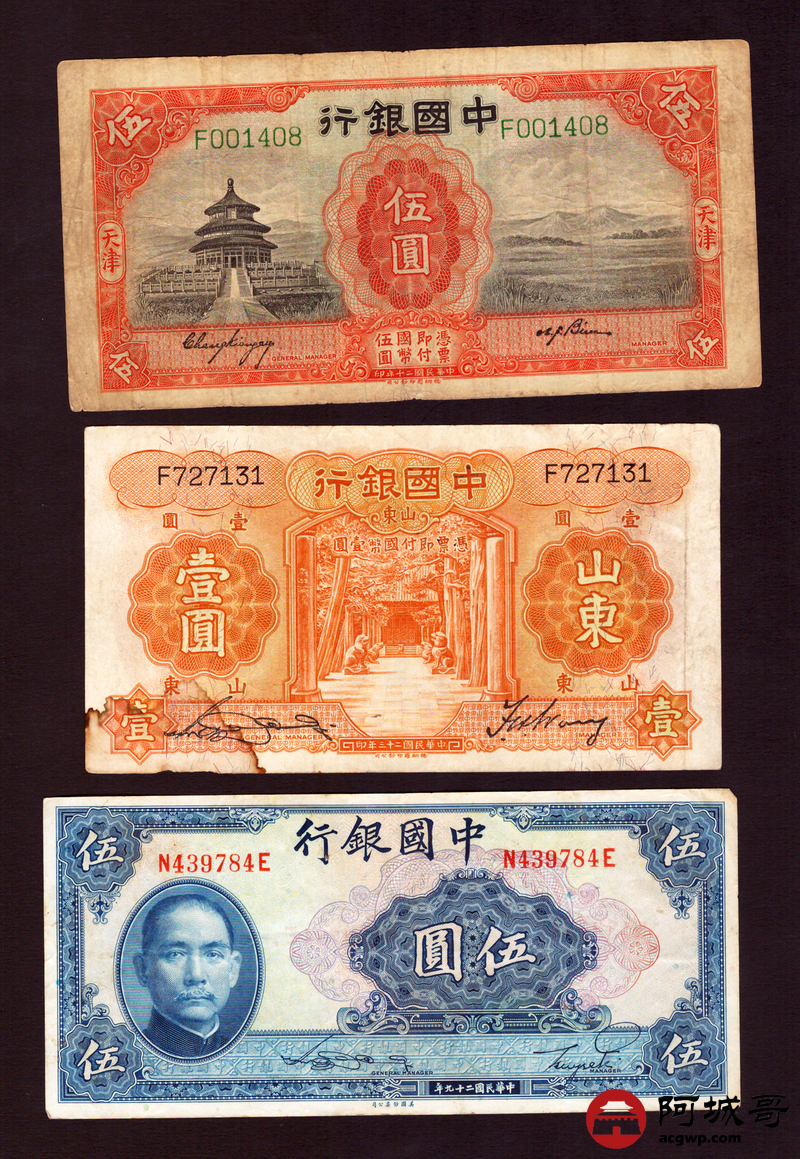 Lot:80 民国时期中国银行纸币3张 从上至下68成新、69成新、78成新