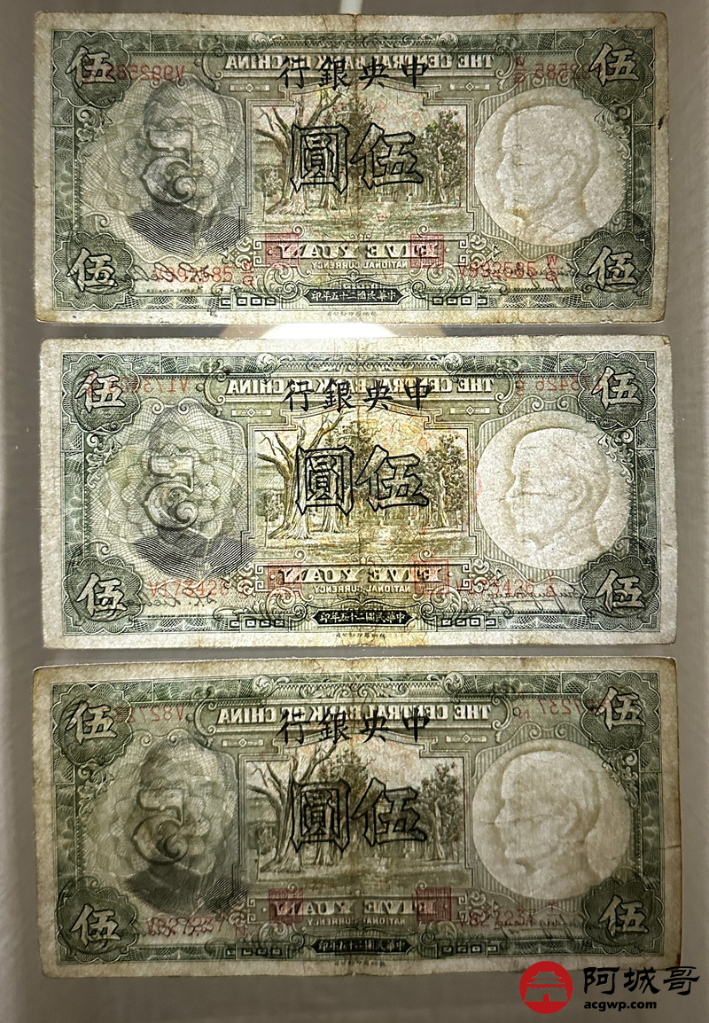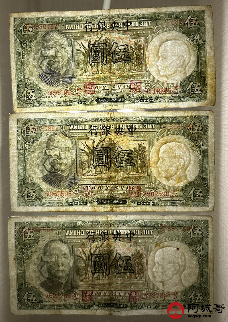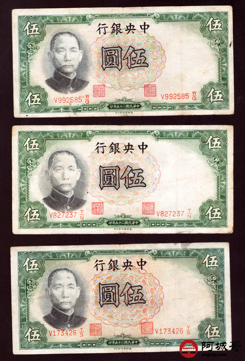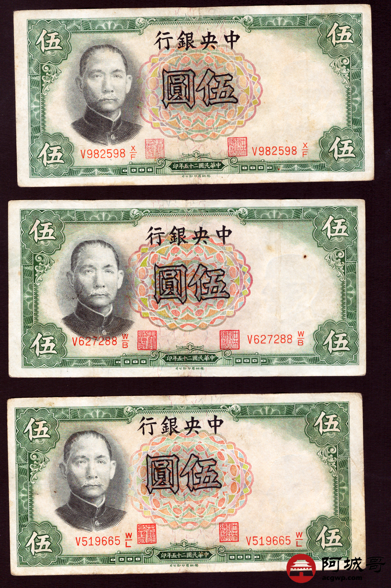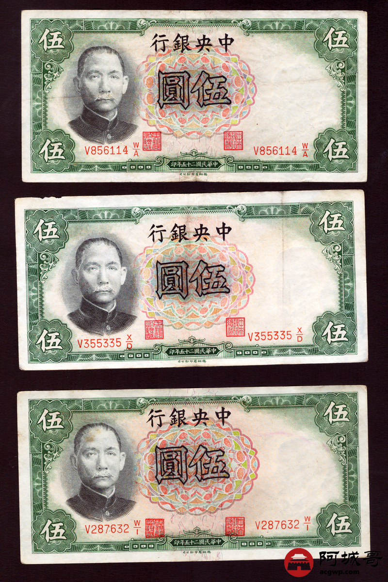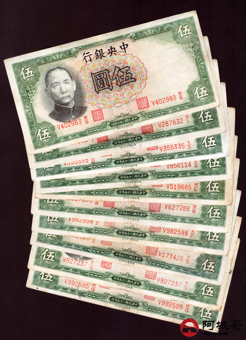 Lot:14 民国25年 中央银行 伍圆 10张一组 7至72成新