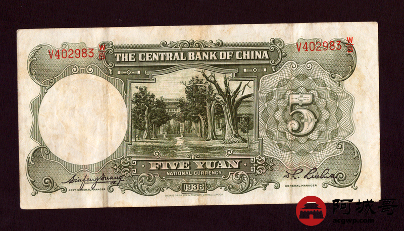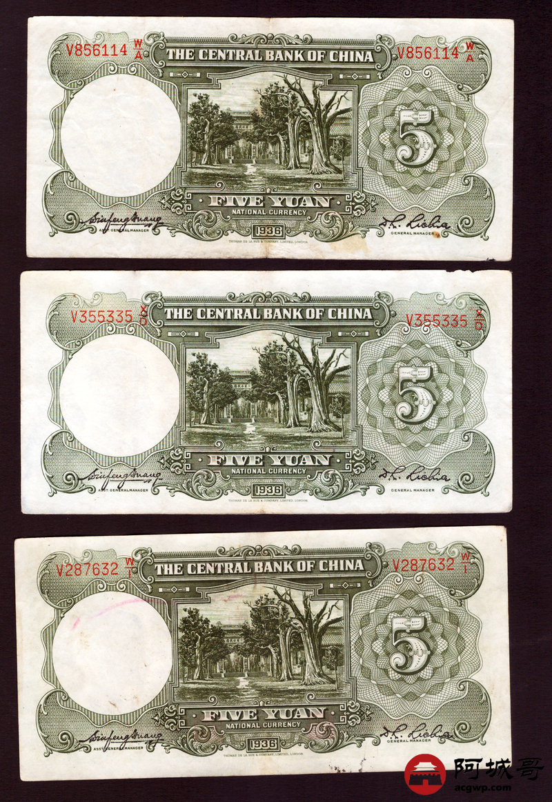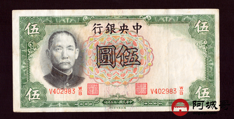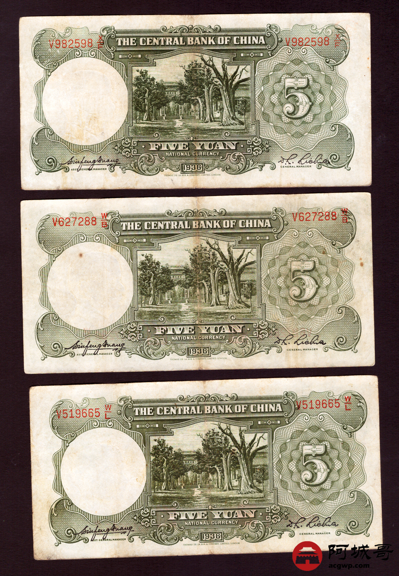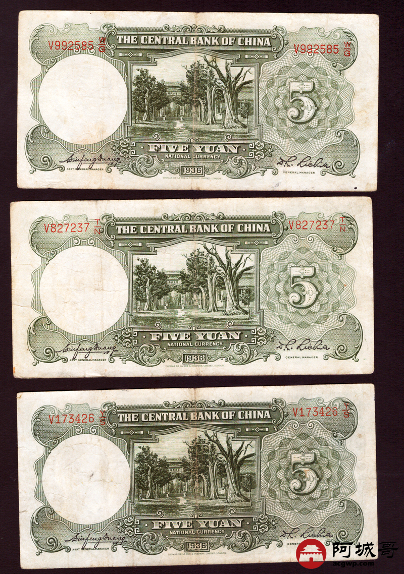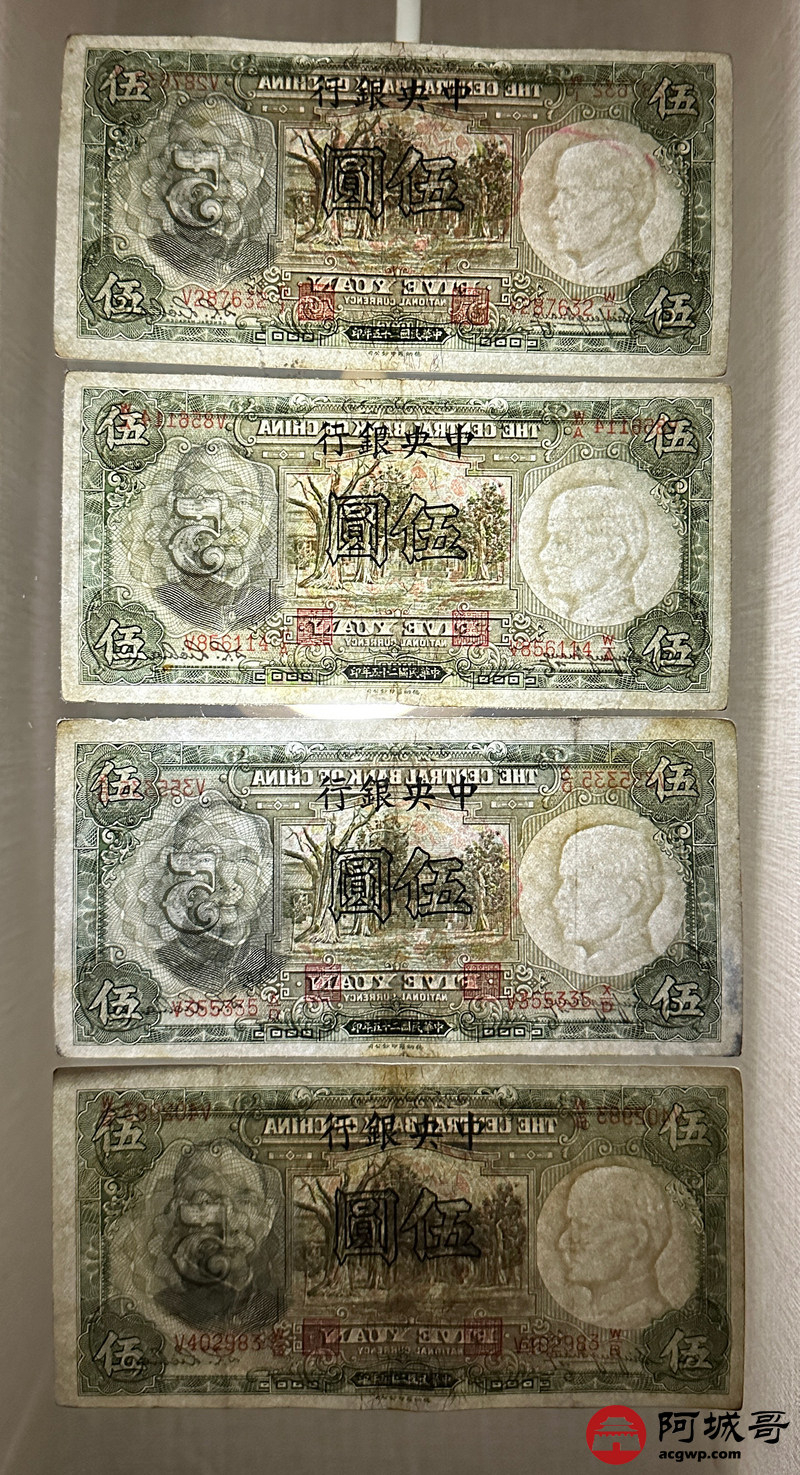 Lot:14 民国25年 中央银行 伍圆 10张一组 7至72成新