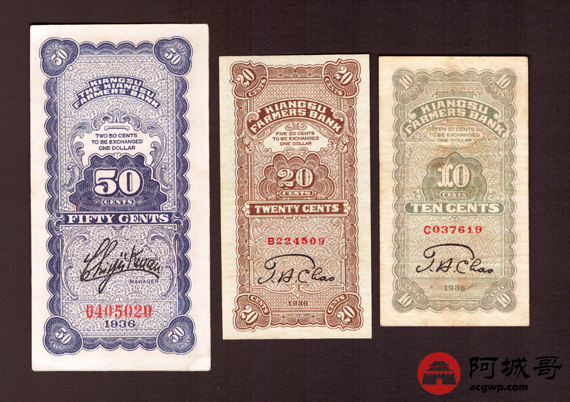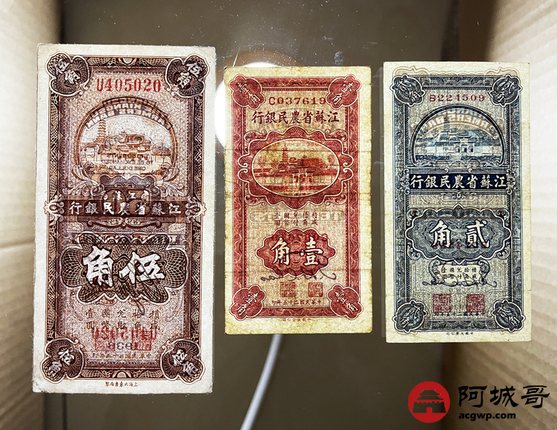 Lot:33 江苏省农民银行 民国25年 壹角、贰角、伍角三张 88至9成新