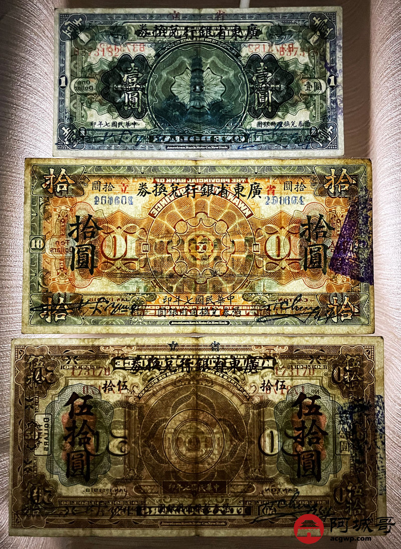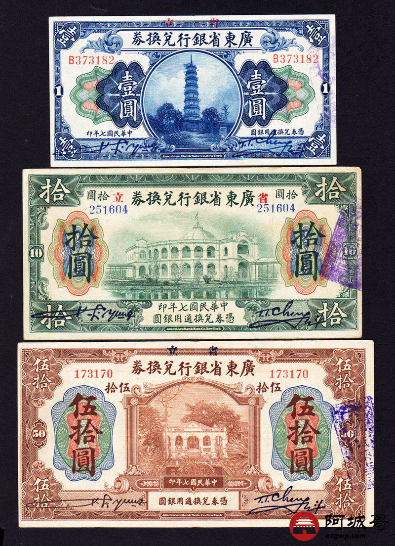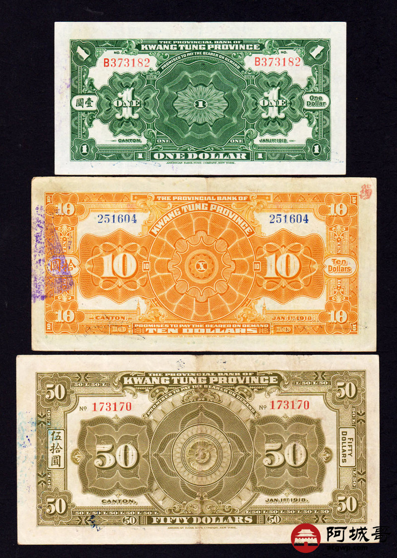 Lot:71 广东省银行兑换券 民国7年 壹圆、拾圆、伍拾圆三张 民国7年 8至9成新