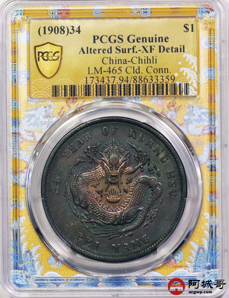 Lot:25 初铸宽边 黑彩 北洋34七钱二分 PCGS XF