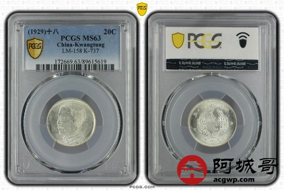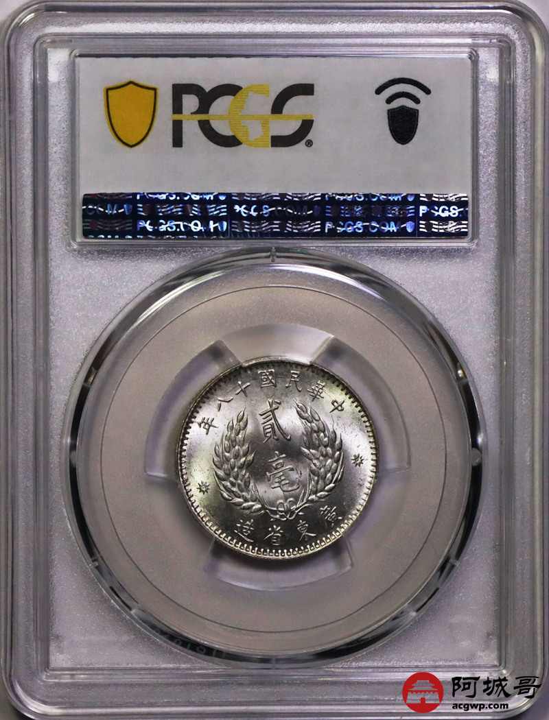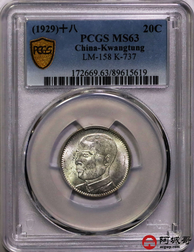 Lot:42 原光民国十八年广东孙像贰豪 PCGS MS63