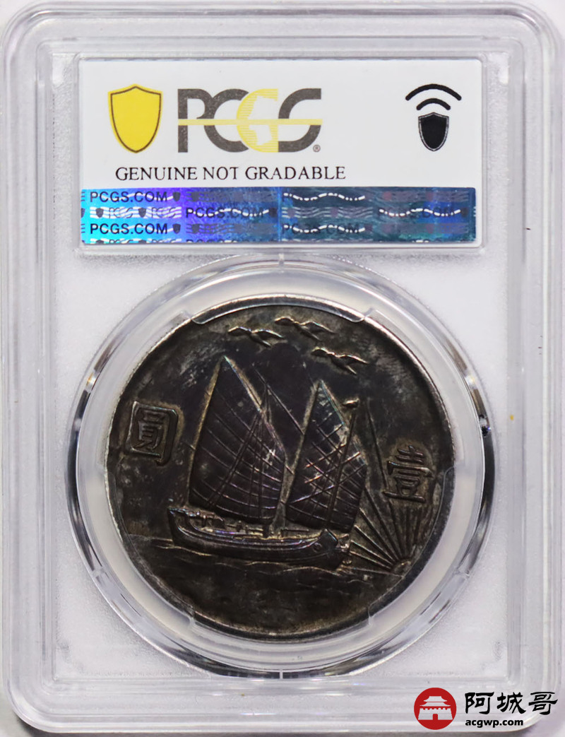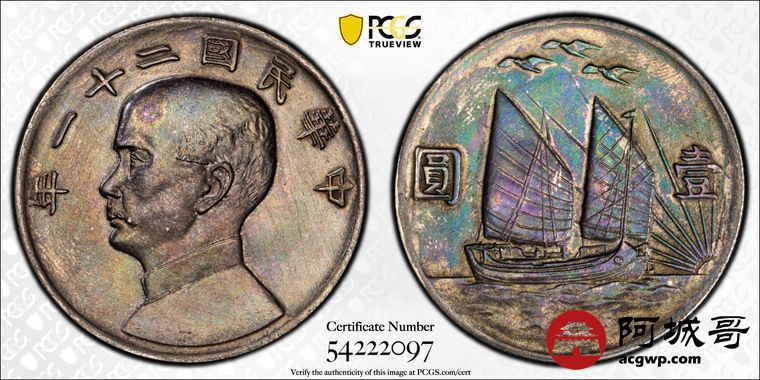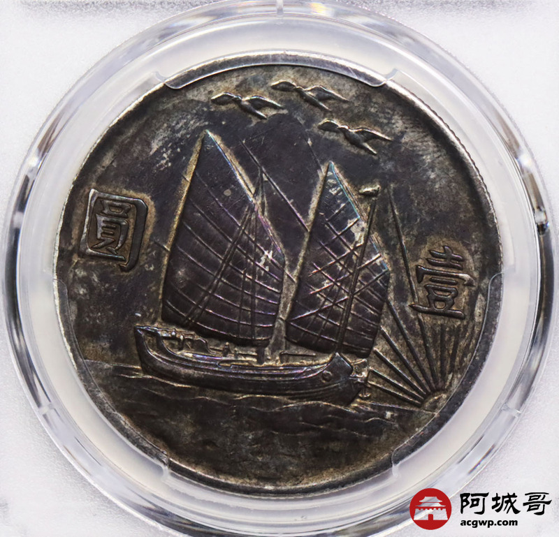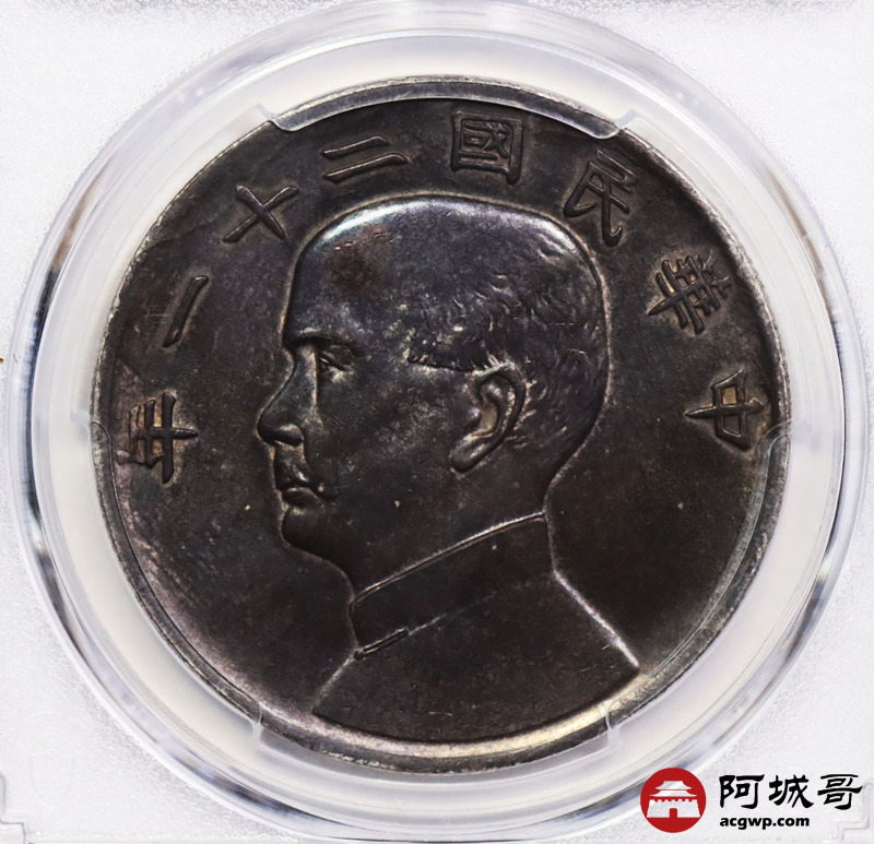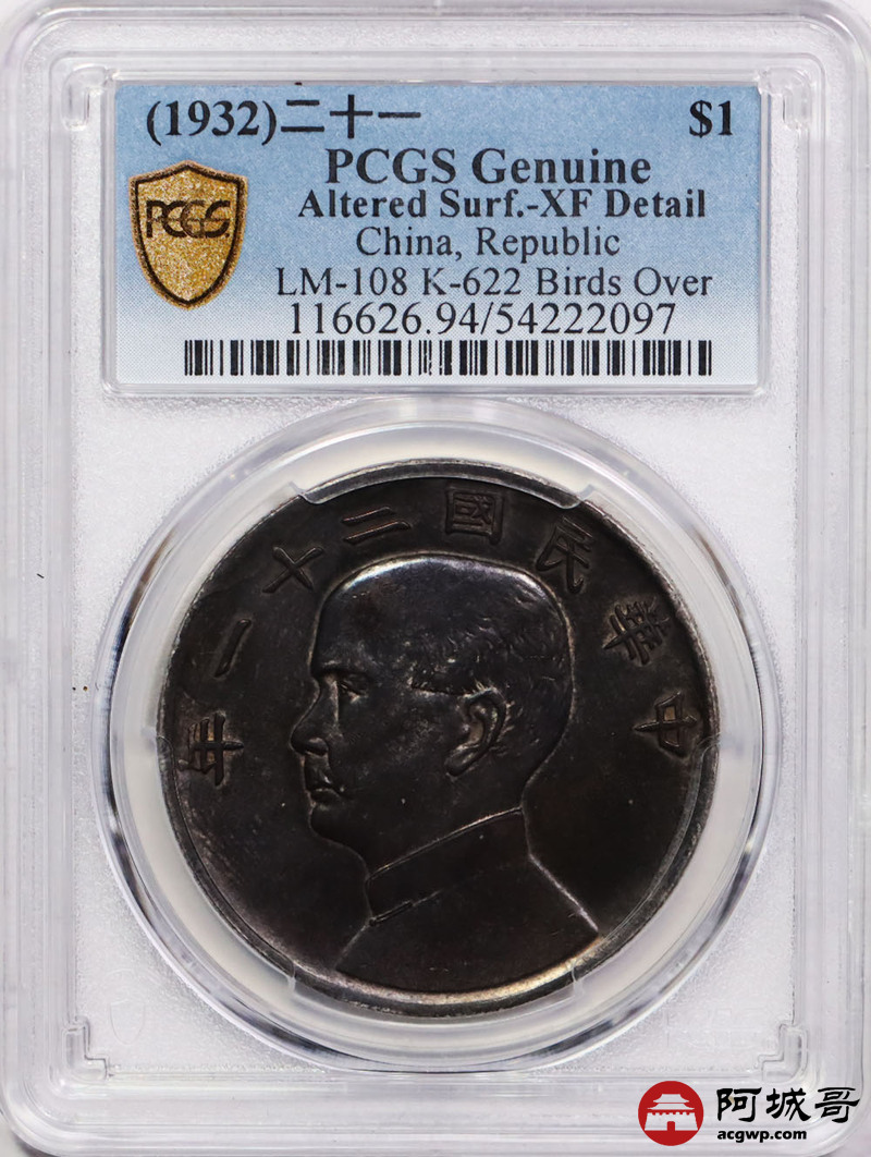Lot:12 A酱彩包浆 带底光 民国二十一年三鸟壹圆 PCGS XF
