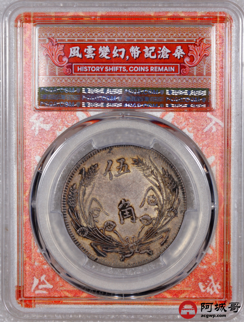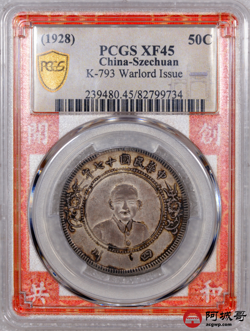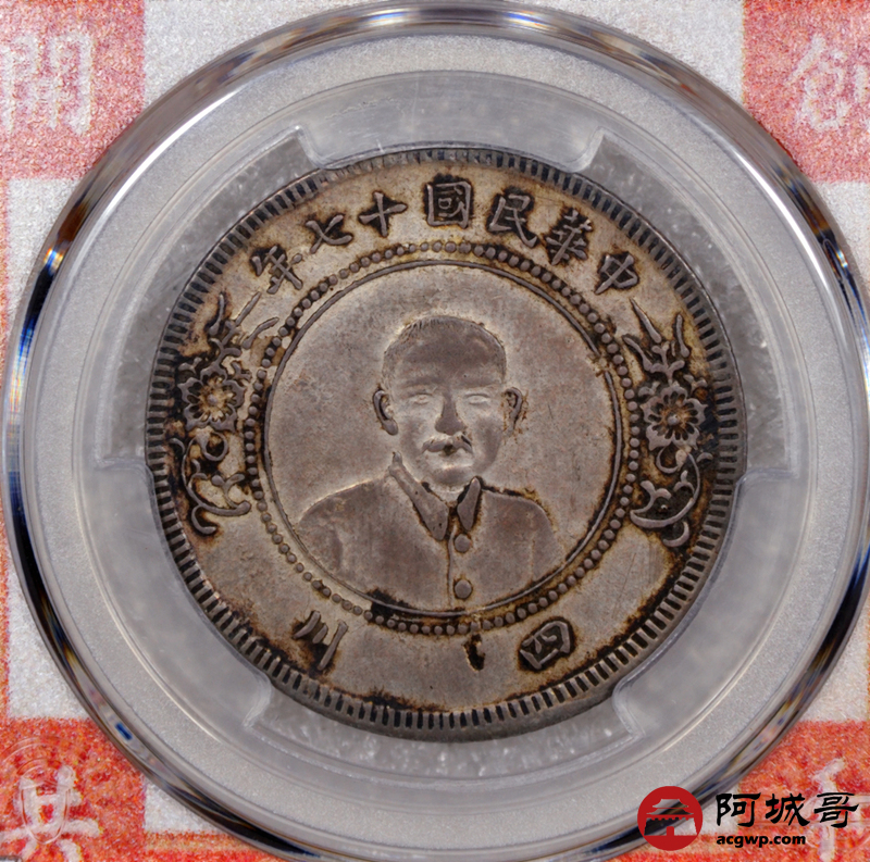 Lot:21 民国十七年四川孙中山像背嘉禾图伍角 原味老包浆 四川军阀割据时期的产物,存世罕见,目前伍角面值获该公司评级有分者仅二枚 PCGS XF45