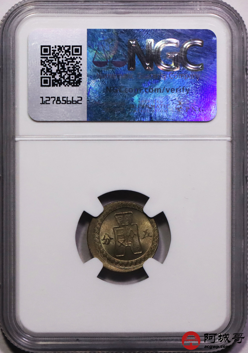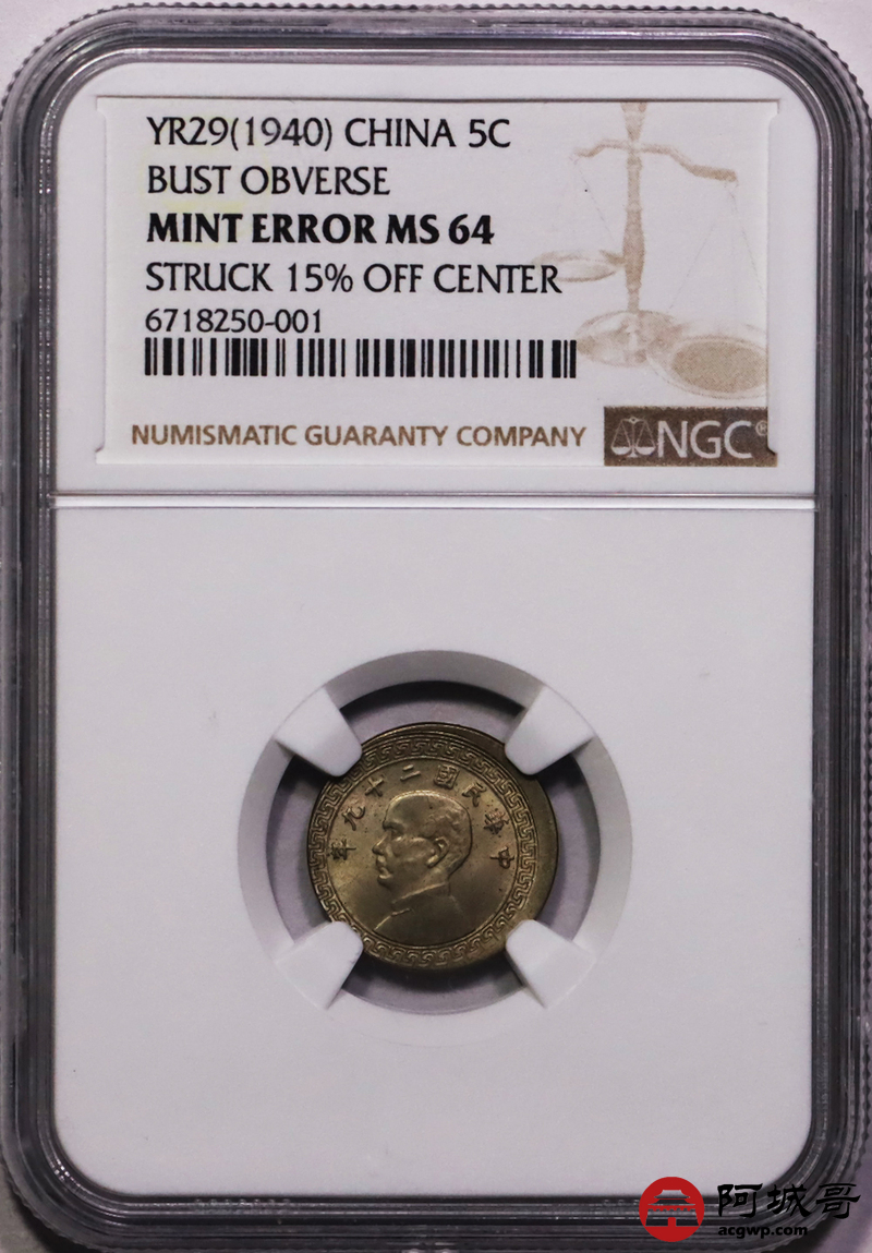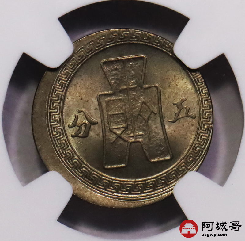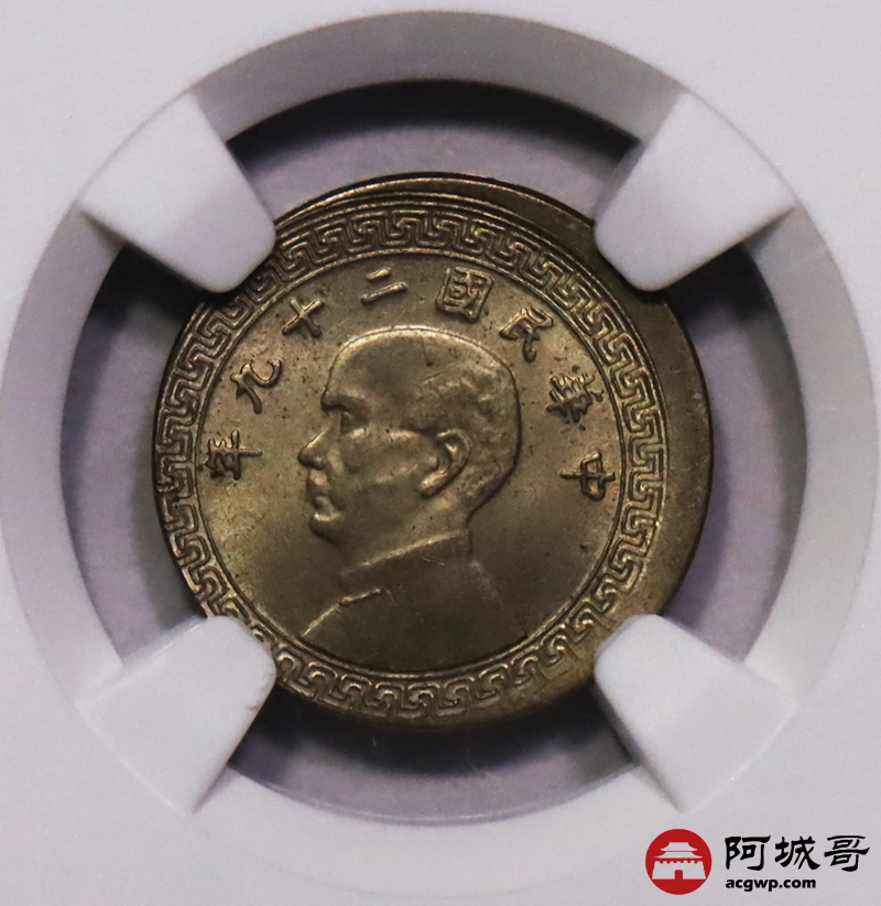 Lot:6 民国二十九年 党徽五分 光边大移位,稀少错版,NGC MS64