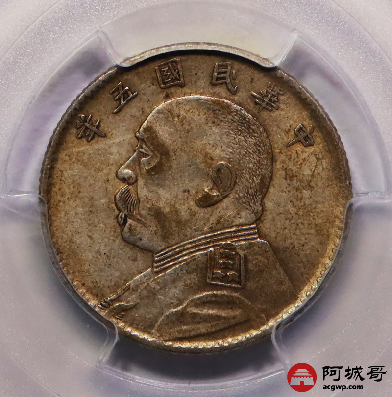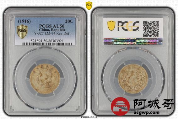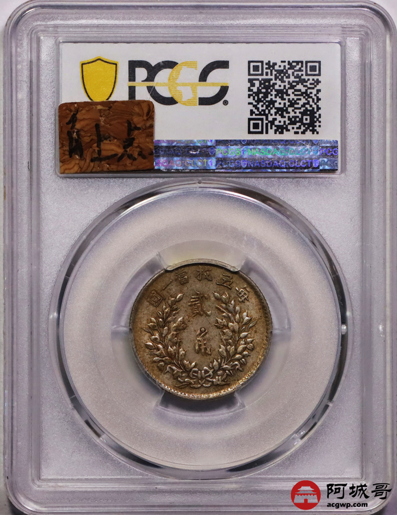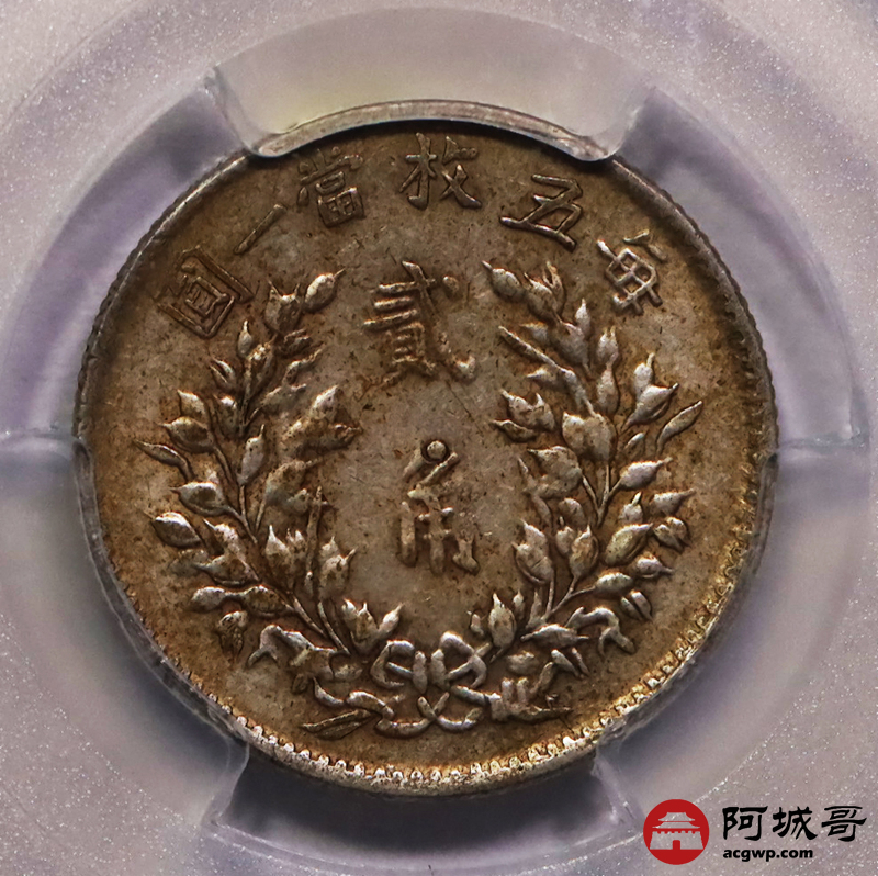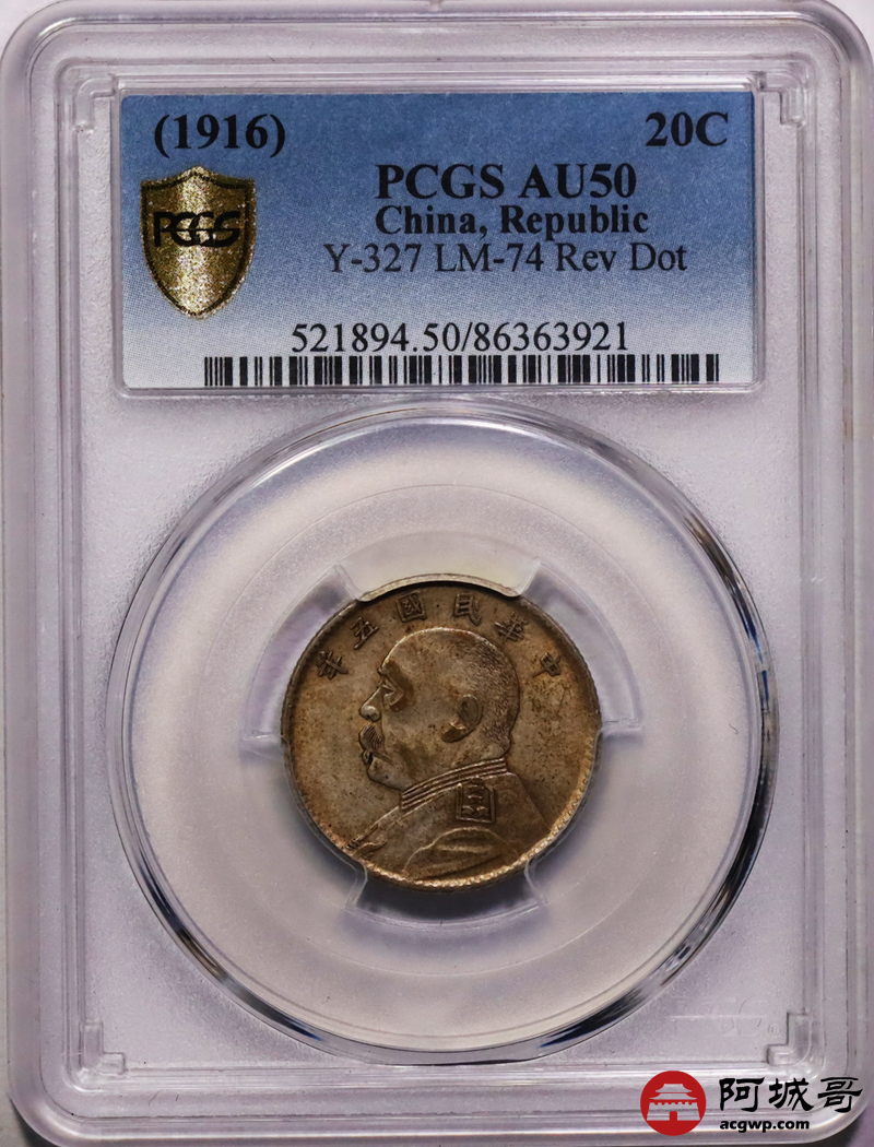 Lot:1 民国五年 大头贰角 稀少角上点版 黄油彩 PCGS AU50