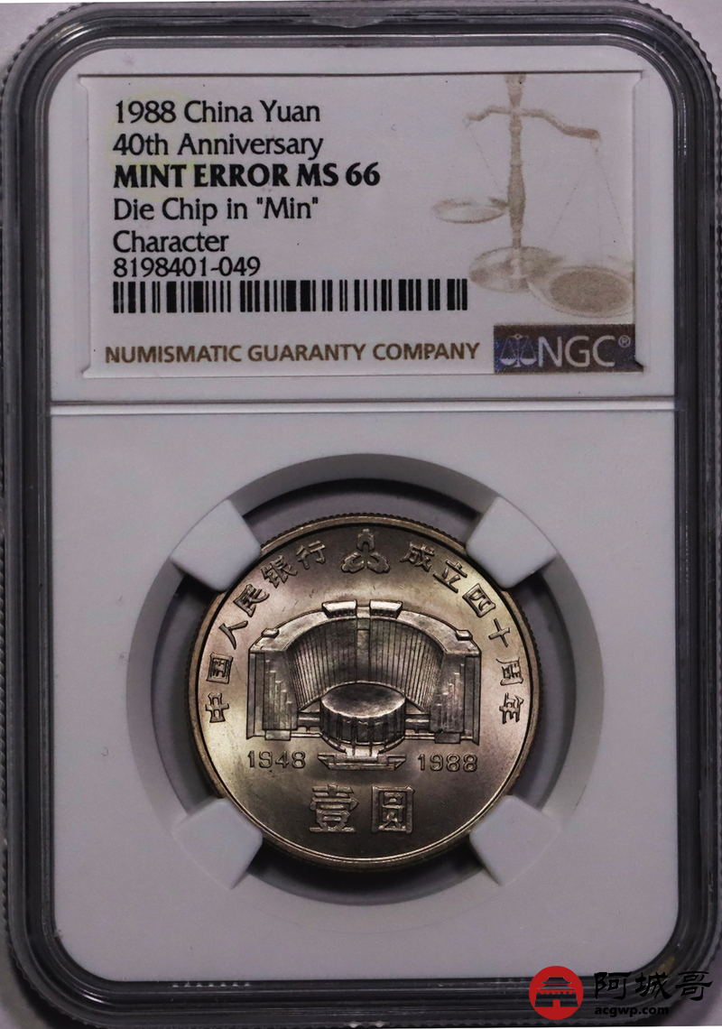 Lot:37 1988建行成立四十周年纪念币 错版 NGC MS66